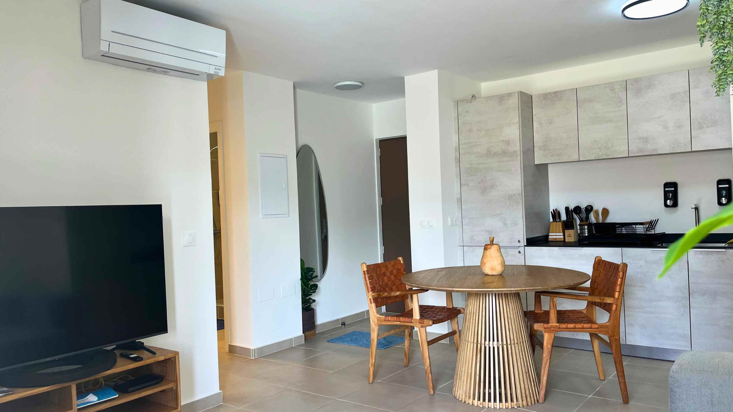 Full air conditioning ensures a cool and pleasant environment, even during hot days in Tahiti. The apartment has Wi-Fi and a television, providing entertainment and connectivity. A children's area is available, and a balcony space allows enjoying the outdoors.