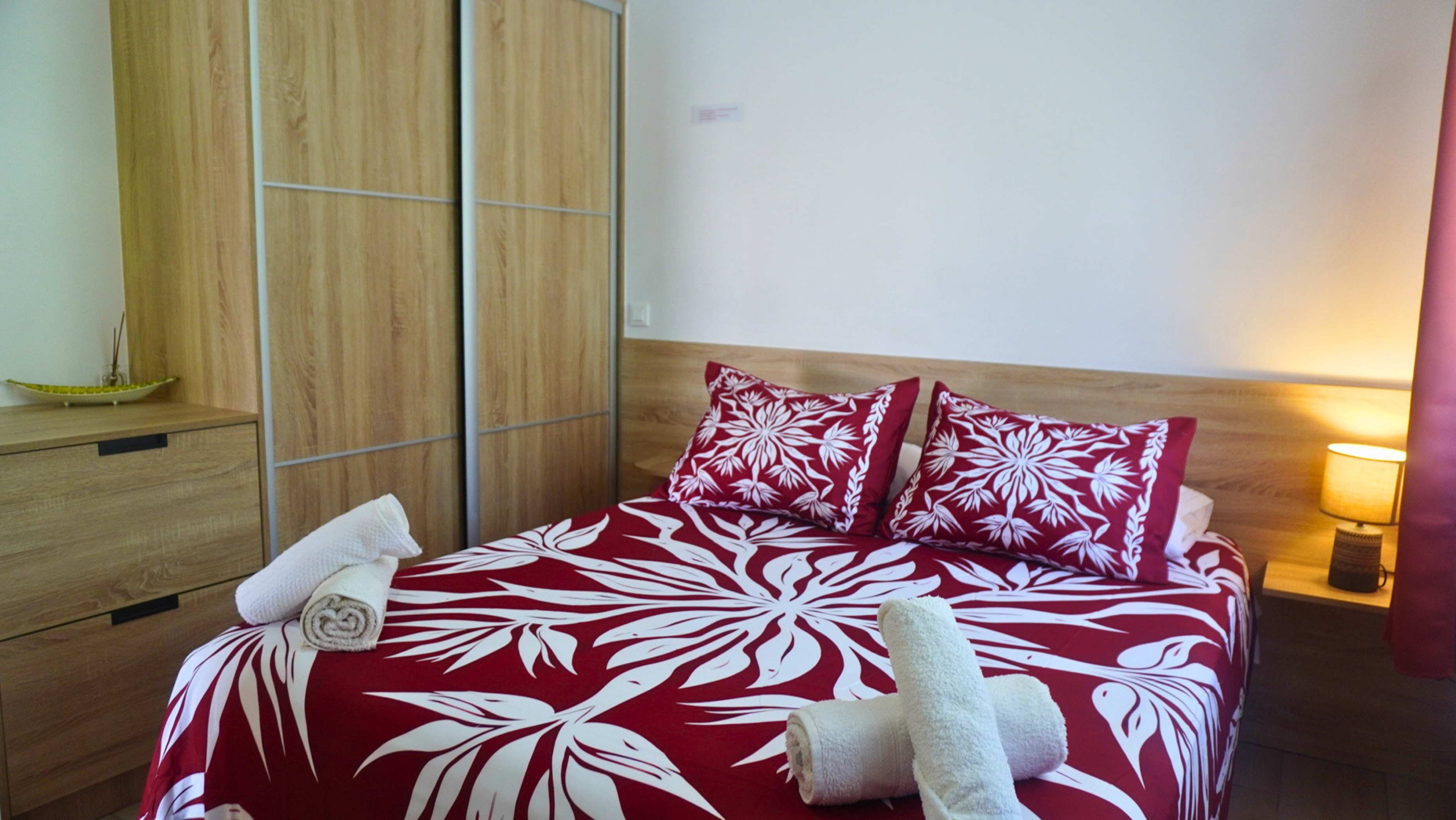 The master bedroom, air-conditioned, offers a Queen Size bed, a large storage cupboard with wardrobe and shelves.
