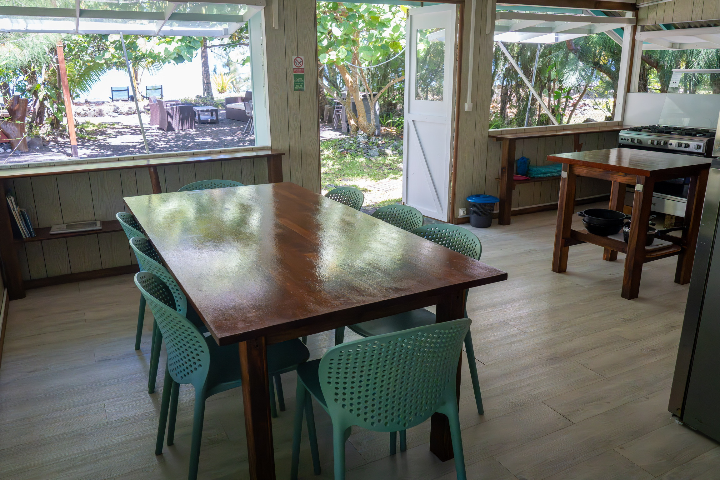 The bungalow consists of a large fitted kitchen (gas stove, refrigerator, kettle, coffee maker and toaster), a dining room and a terrace open to the lagoon as well as a lounge area