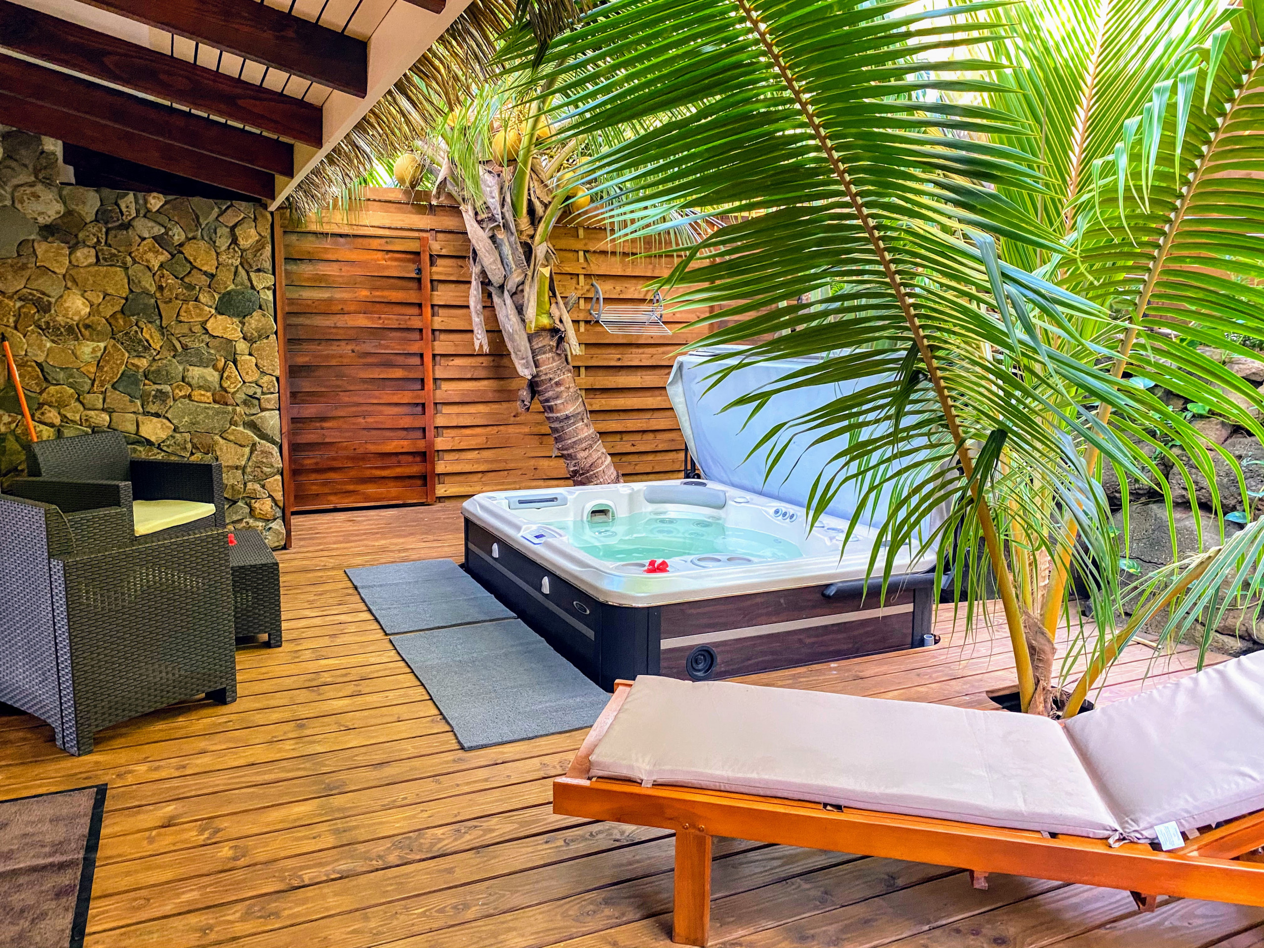 Just Chill Inn will offer you a soft and cozy atmosphere. The bungalow is air conditioned and can accommodate 4 people comfortably. You will appreciate the elegance of the place mixed with the charm of the islands. The private terrace and its jacuzzi will certainly be your favorite place. A veritable Garden of Eden with plant and cocooning atmospheres will accompany your evenings.