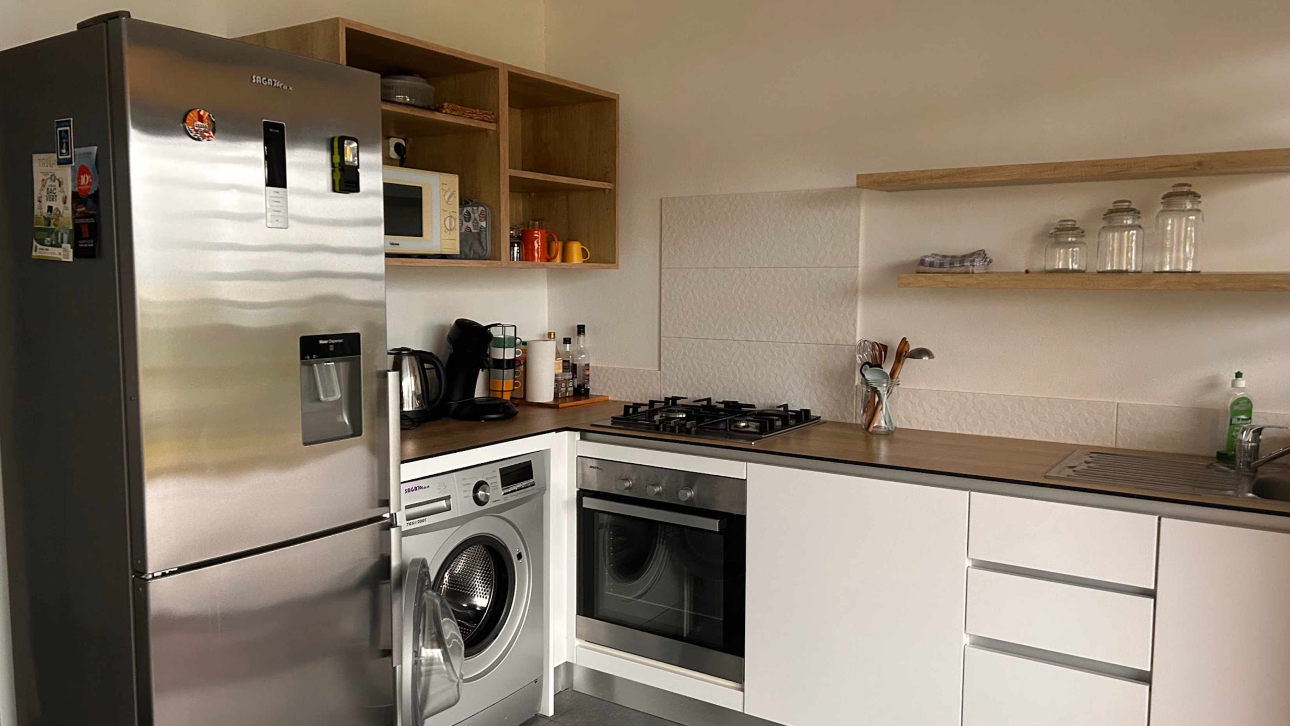 1 fully equipped kitchen: refrigerator, oven, microwave, toaster, coffee maker and electric kettle – everything necessary to prepare your home-cooked meals.