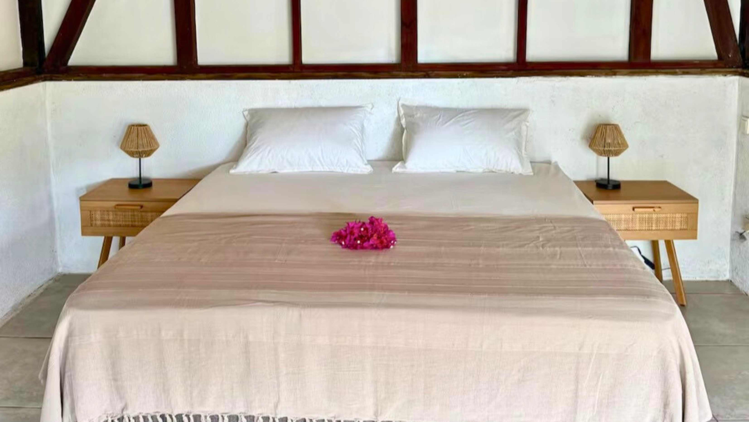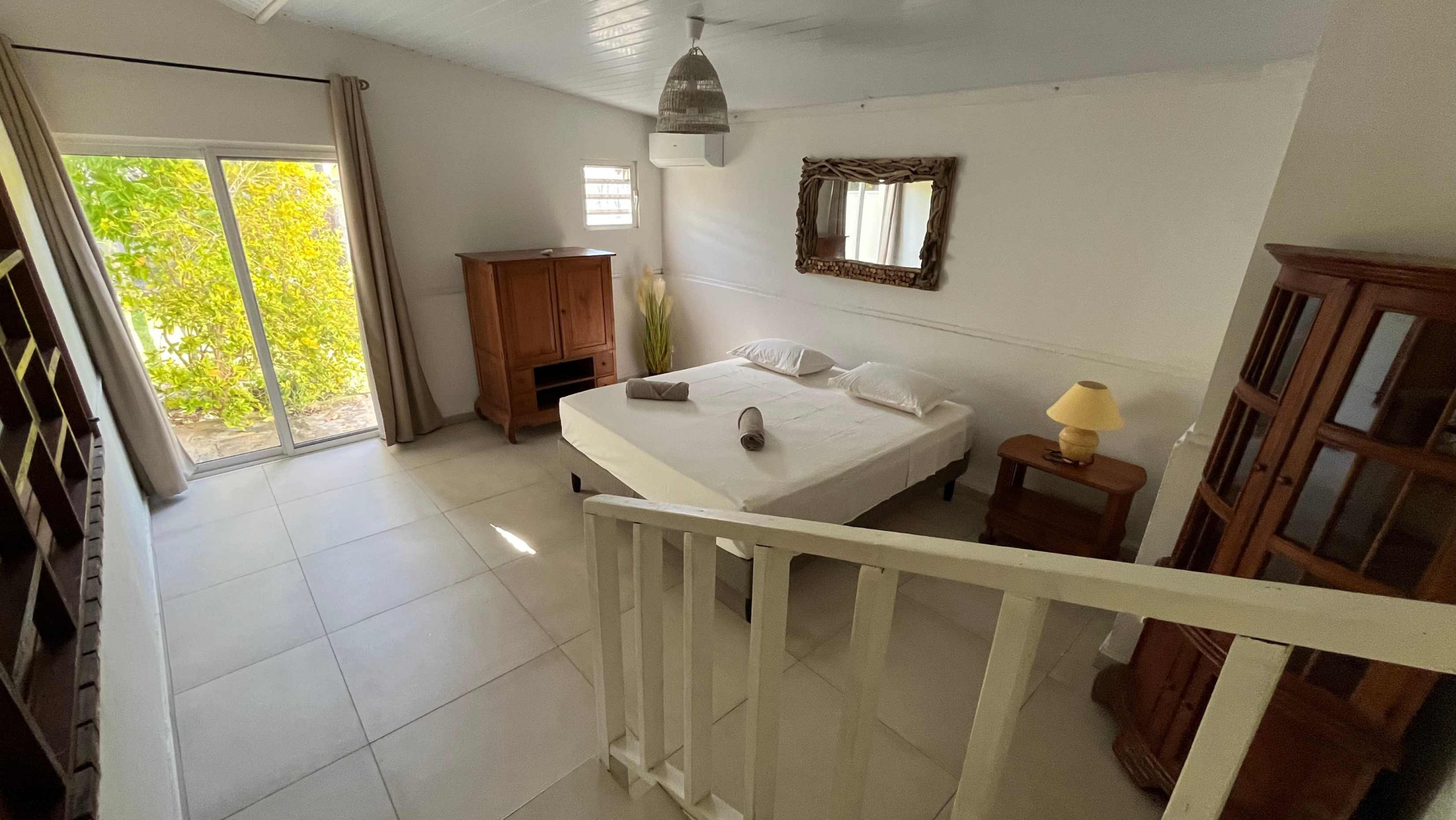 The house is composed of 2 private and air-conditioned bedrooms, each with 1 double bed and 1 mezzanine with 2 single beds.