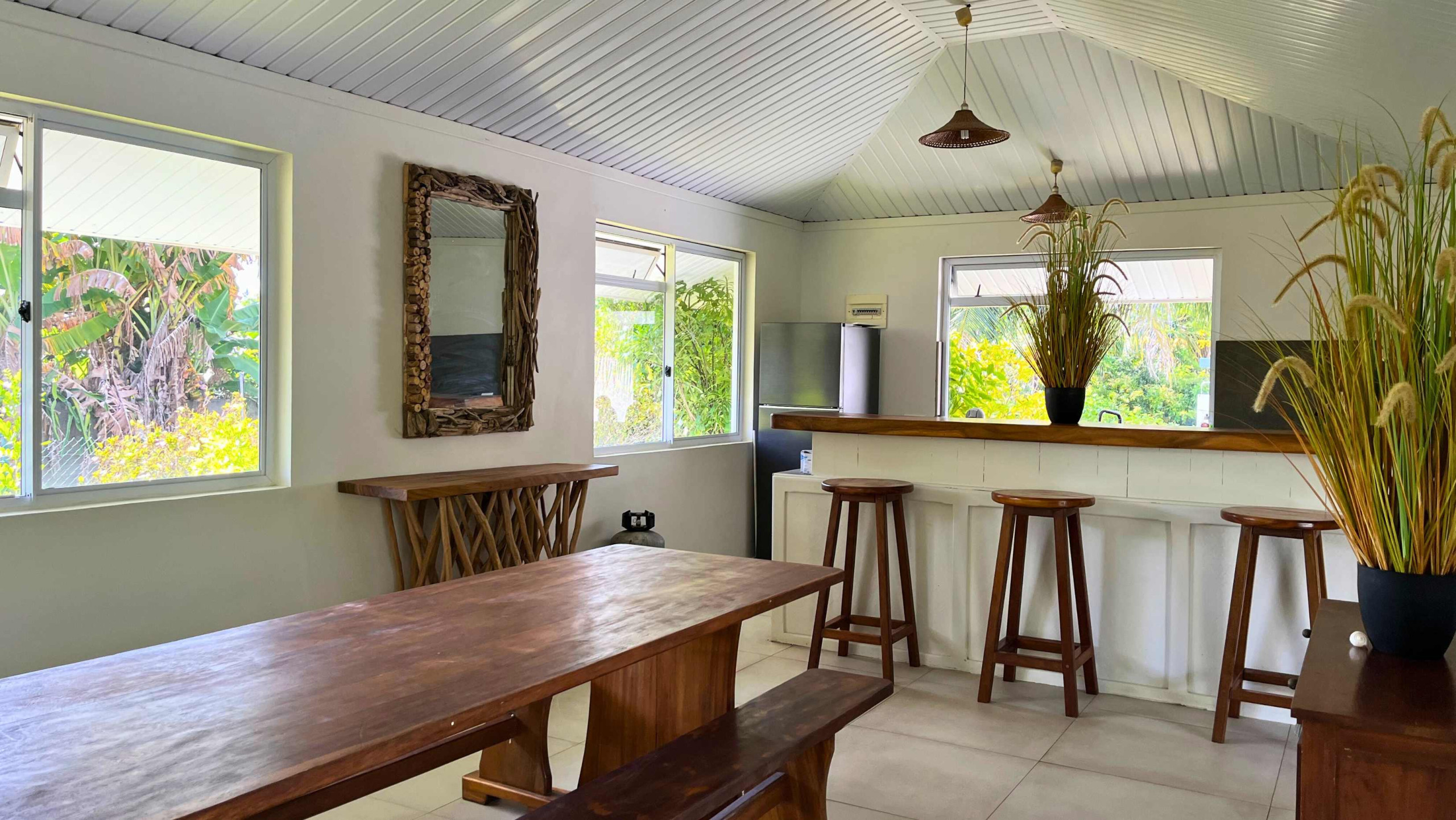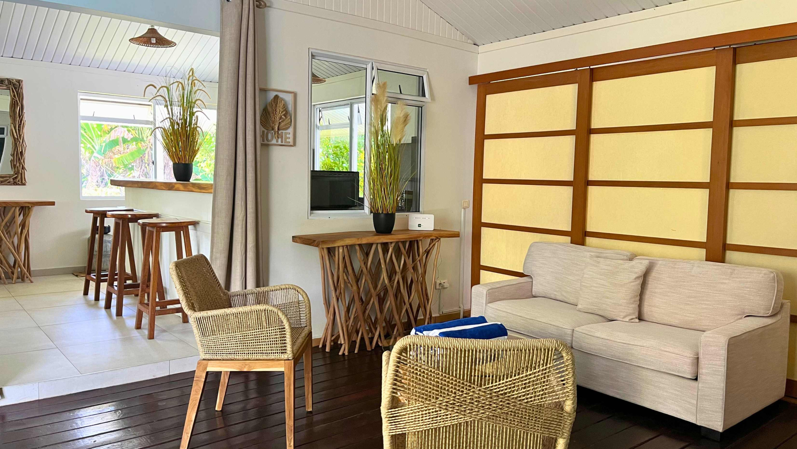 *The Living Room, elegant and understated, with a 3-seater sofa and its Smart TV with Netflix, from where you can comfortably discover the programmes and shows of Fenua as well as your favourite series.