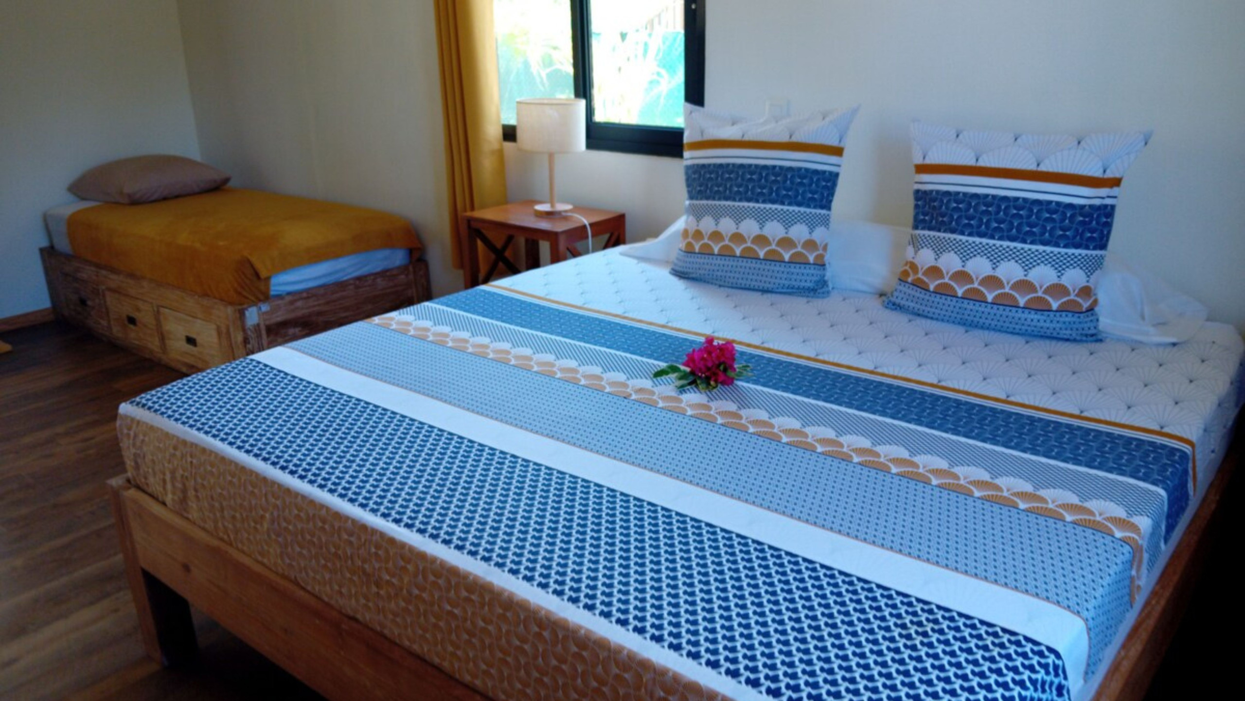The bungalow can accommodate 2 adults and 2 children. It includes a queen-size bed, a double sofa bed, a modern bathroom with shower and toilet, as well as a kitchenette equipped to prepare your meals independently. Outside, a small terrace allows you to share your meals or enjoy the softness of Polynesian evenings.