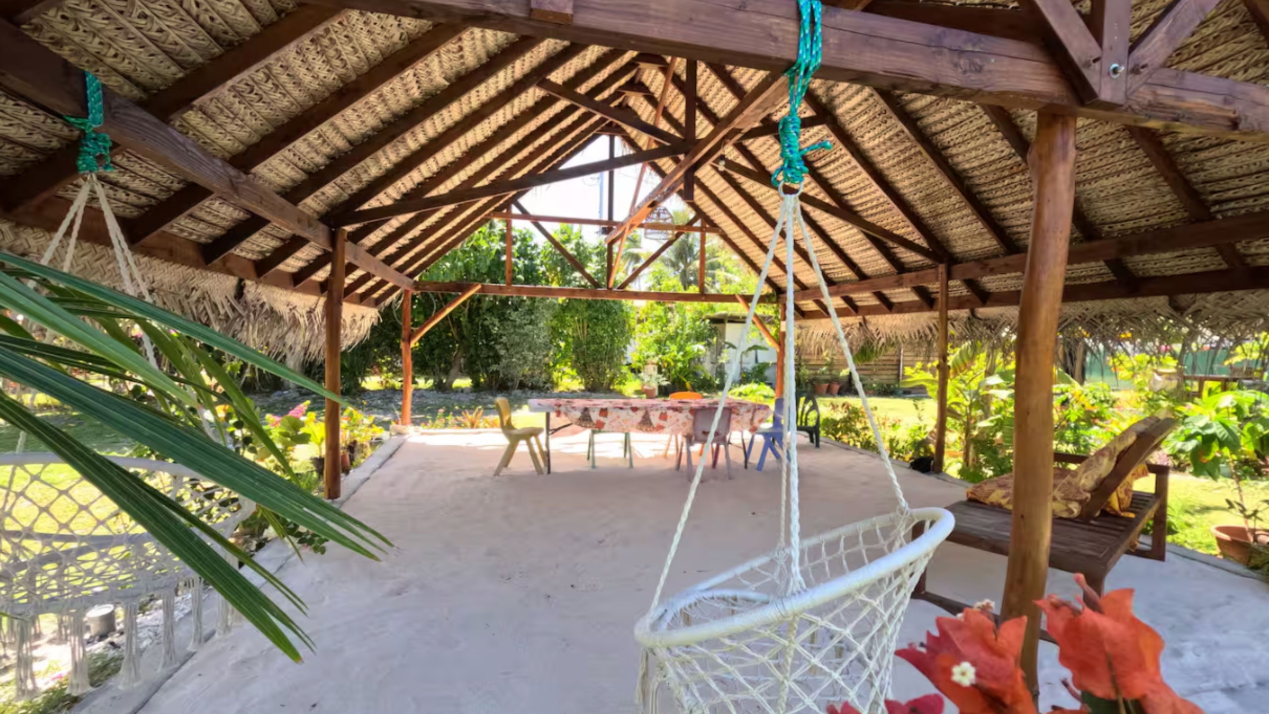 Enjoy a peaceful stay with your family at Fare Poe 1, a modern and air-conditioned bungalow nestled halfway between the ocean and the lagoon. Located just steps away from the island's only pearl farm, as well as a convenience store and a pizzeria, it combines comfort and convenience for your holiday in Rangiroa.
