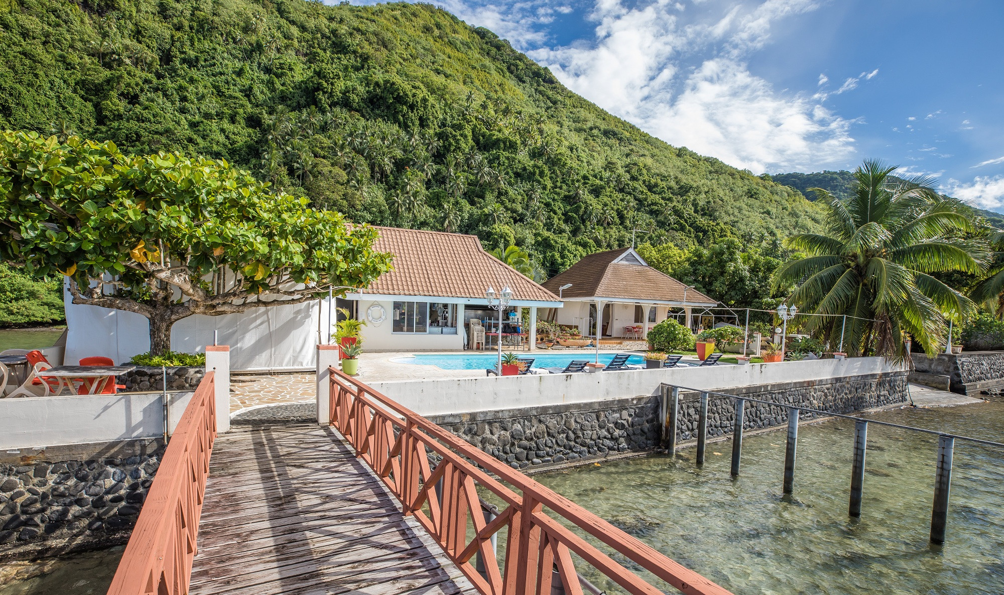 On the edge of the lagoon, a beautiful shared swimming pool with deckchairs for sunbathing. A Fare Pote is at your disposal with tables and benches for aperitifs and meals, and for admiring the sunsets over the lagoon.