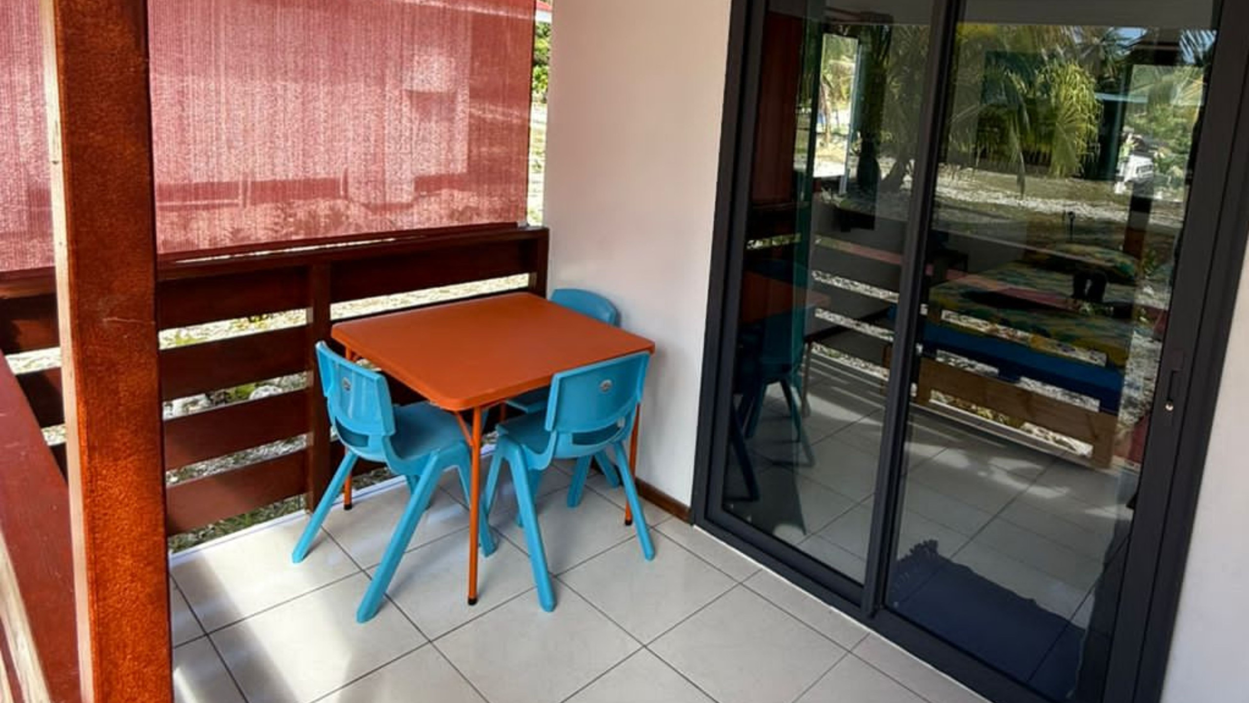 The accommodation can accommodate up to 5 people and features a bedroom area with two queen-size beds and a single bed. The large covered terrace is perfect for sharing a meal, relaxing after a day at the lagoon, or simply enjoying the tranquillity of the island. You will find an indoor bathroom with hot water, complemented by a convenient outdoor shower upon returning from the beach. The fitted kitchen allows you to prepare your meals independently, and the bungalow is equipped with WiFi, a washing machine, and a drying area for added comfort.
