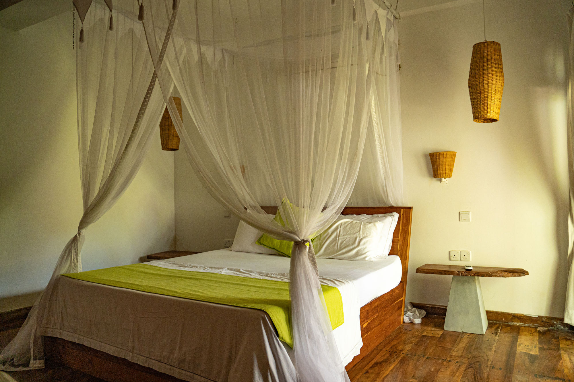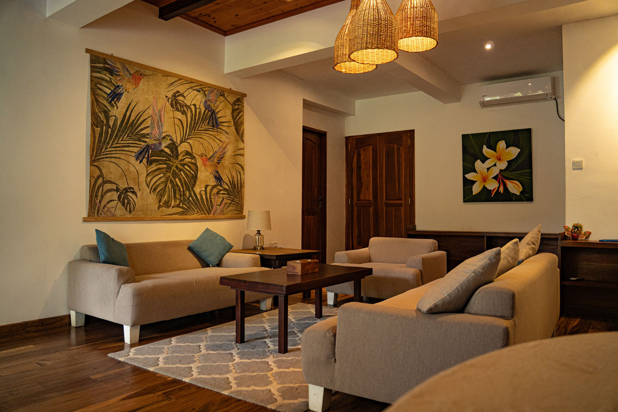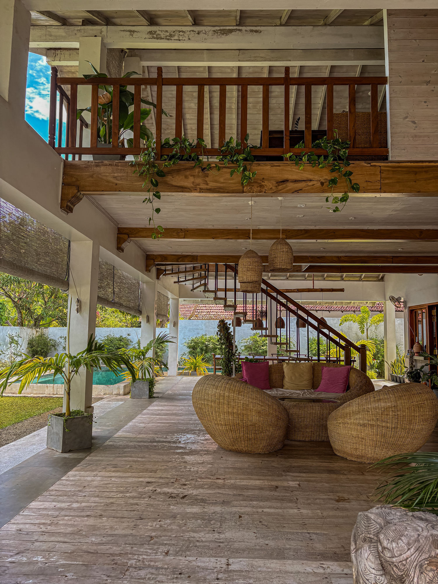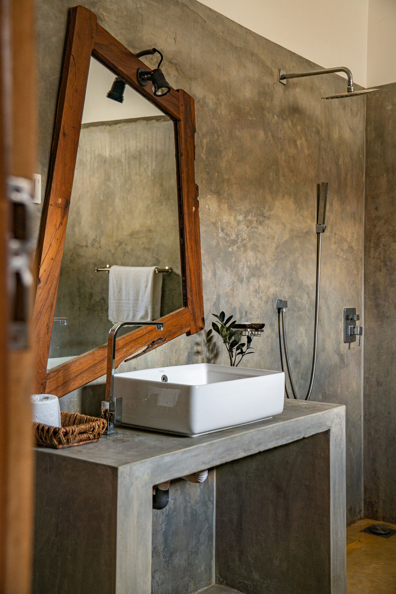The villa is organized around four spacious suites, all equipped with queen-size beds and high-end bedding. Each room has its own private bathroom, some with outdoor showers in polished concrete that invite moments of relaxation in nature, alone or with a partner. The cathedral ceilings accentuate the feeling of space and freedom, while bringing freshness and clarity.