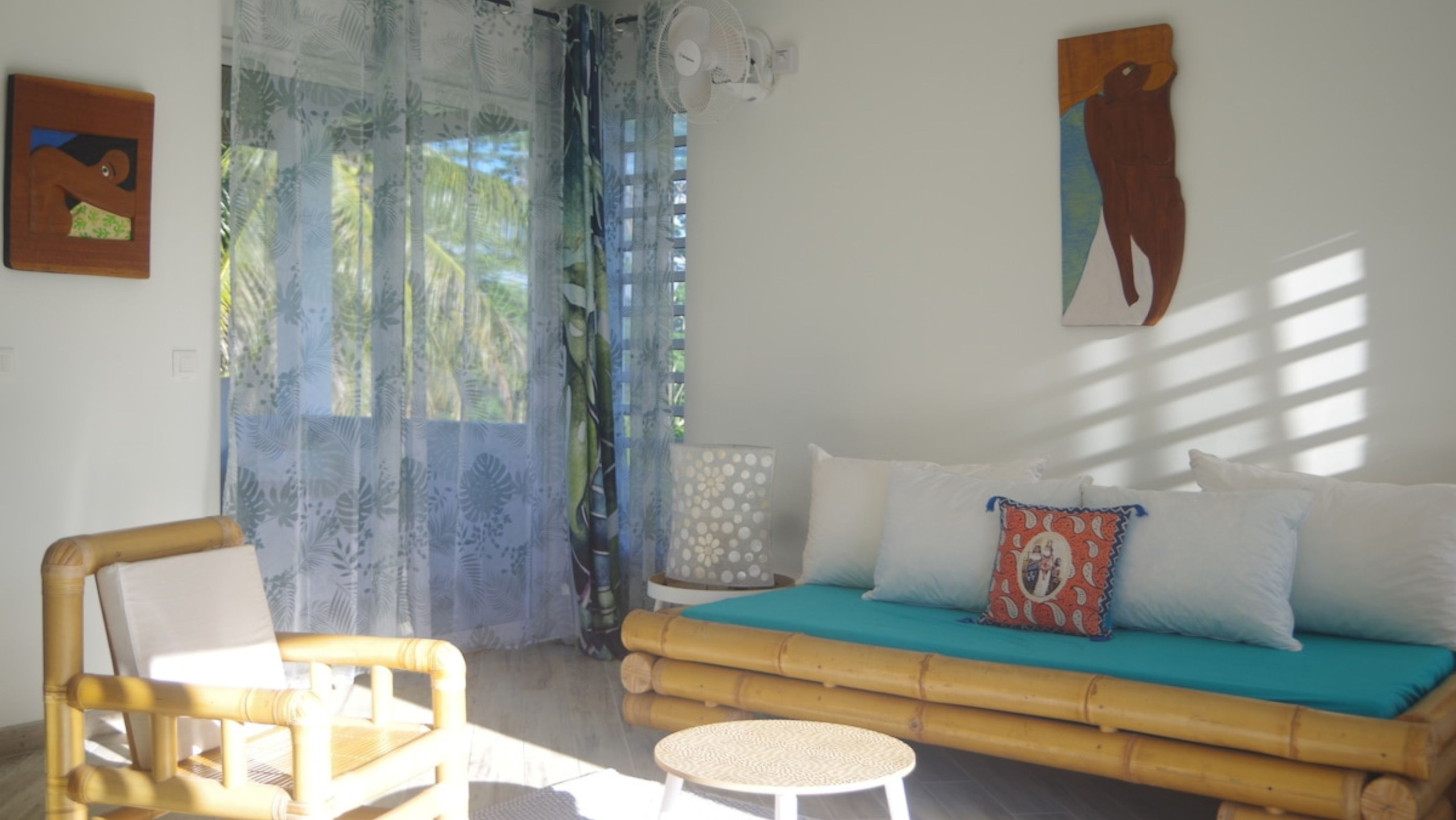 Nada más entrar, descubres una habitación luminosa de 24 m², perfectamente diseñada para una estancia cómoda. La zona de descanso está compuesta por una cama Queen Size con mosquitera, mientras que el espacio de estar ofrece un sofá-cama y un TV Android conectado (Netflix y Prime Video incluidos). Las persianas y los ventiladores garantizan una ventilación natural muy agradable.
