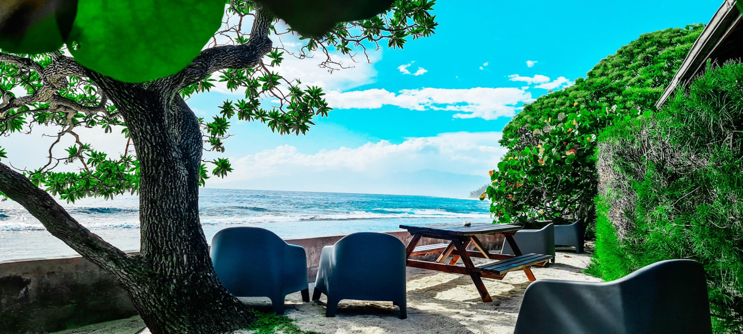 La terraza cubierta ofrece una vista impresionante del mar y su playa de arena. La terraza cuenta con una zona de comedor con mesa y sillas y tumbonas para tomar el sol, dormir la siesta o leer un buen libro.