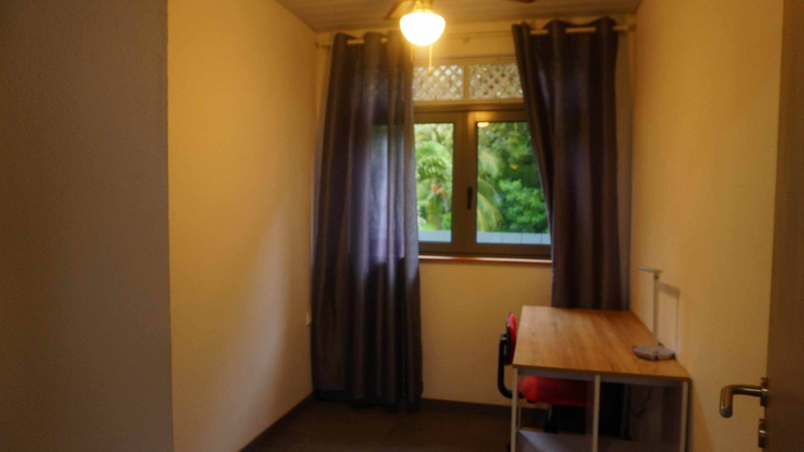 1 habitación climatizada con cama doble, espacio de almacenamiento y ventilador de techo, + escritorio y TV conectada