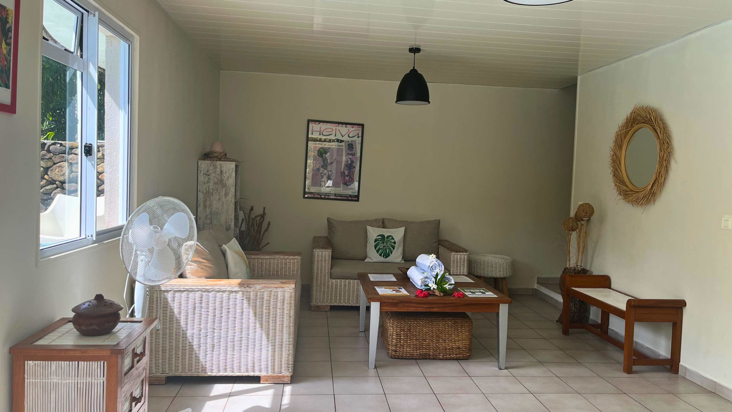 La casa se abre a una luminosa sala en la planta baja, equipada con un ventilador de pie para su comodidad, y una cocina totalmente equipada, perfecta para preparar sus comidas con toda simplicidad.