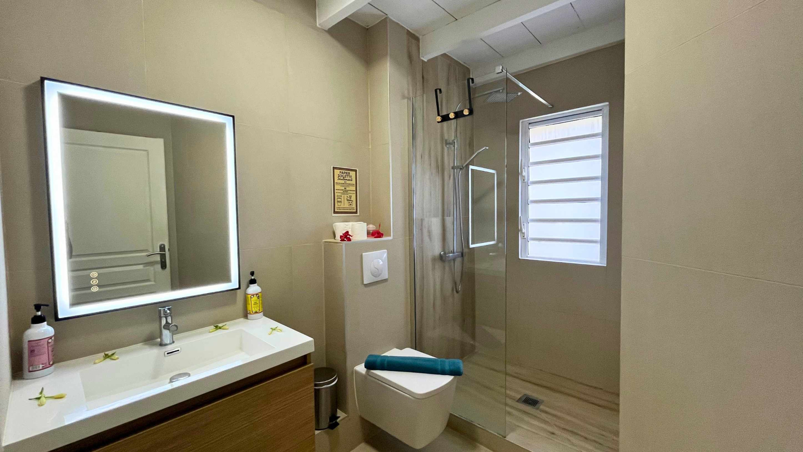 El baño está equipado con un secador de pelo, así como gel de ducha y champú para su comodidad.