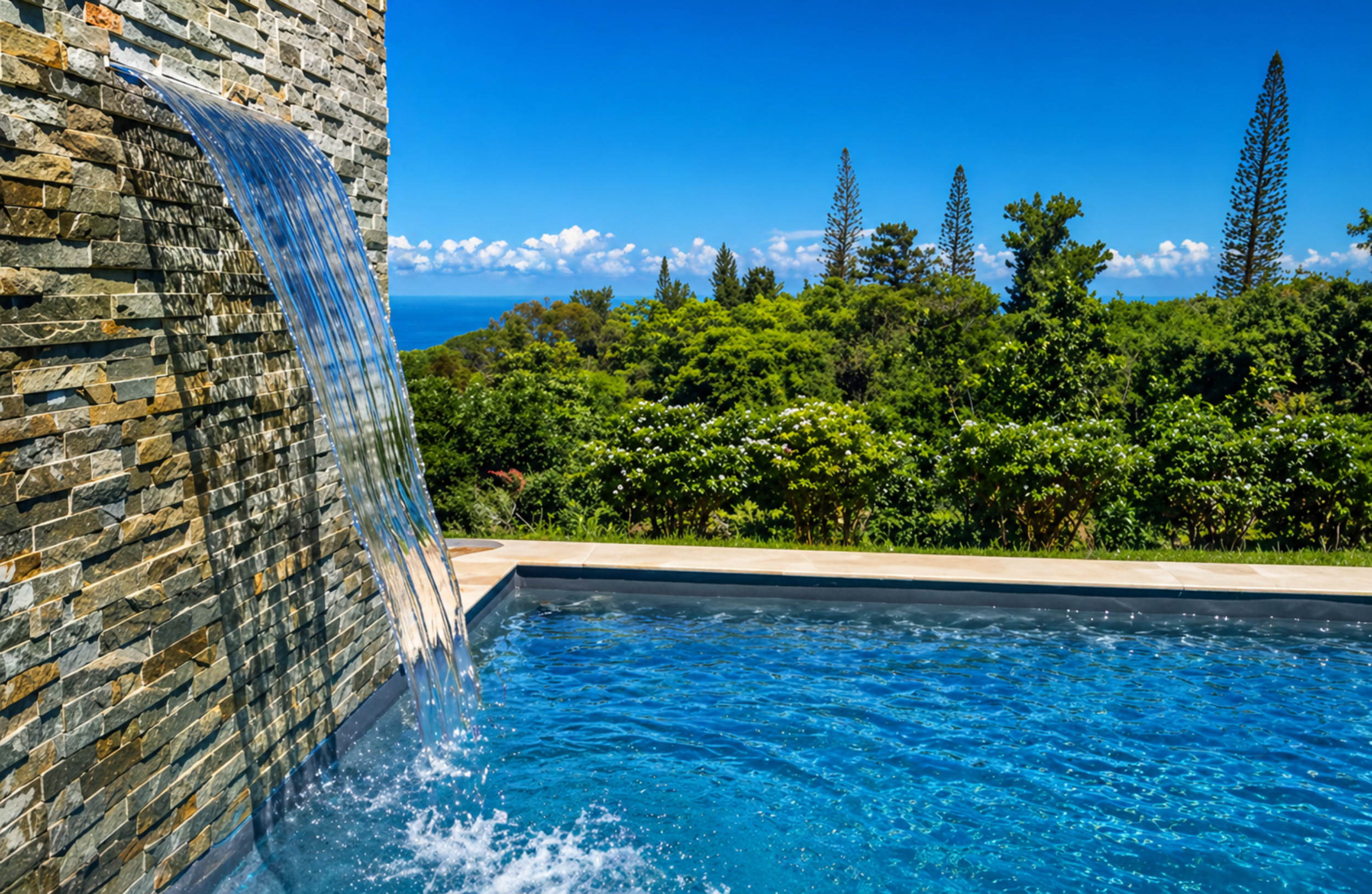 Una piscina con cascada con vista espectacular sobre la laguna y la isla de Moorea, ideal para refrescarse a cualquier hora del día