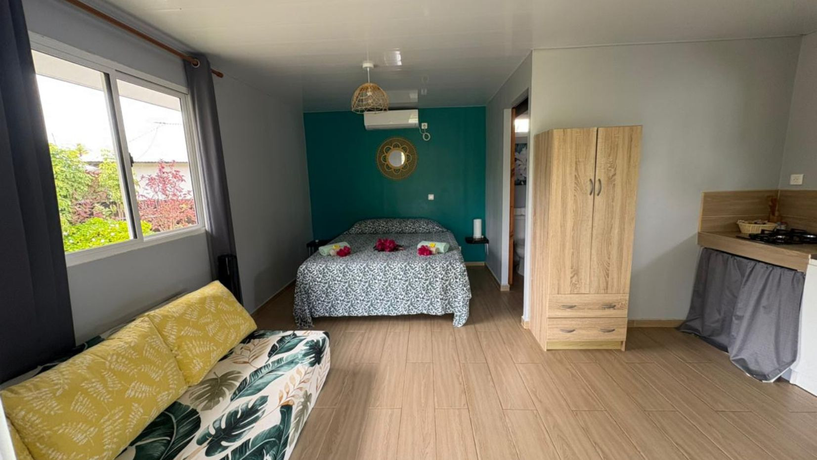 El bungalow puede acoger a 2 adultos y 2 niños. Incluye una cama queen size, un sofá-cama doble, un baño moderno con ducha y aseo, así como una cocina equipada para preparar sus comidas de forma autónoma. En el exterior, una pequeña terraza permite compartir sus comidas o disfrutar de la suavidad de las noches polinesias.