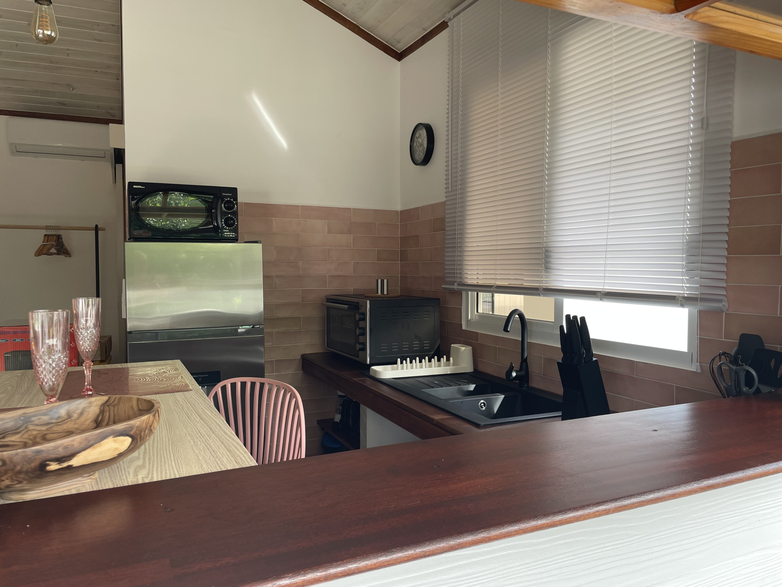 Con una superficie de 35 m², el bungalow se compone de un espacio principal luminoso que incluye: