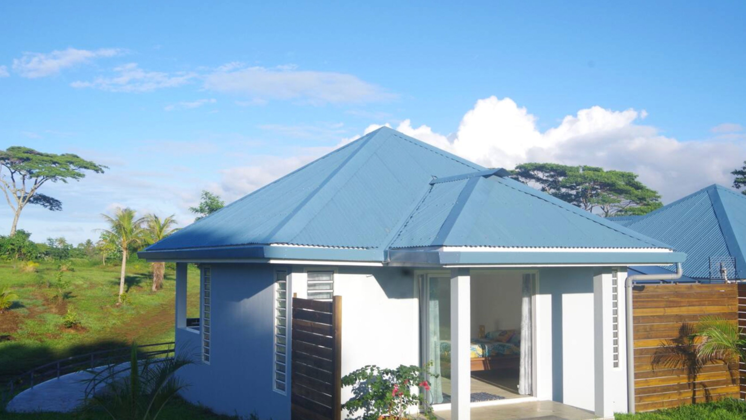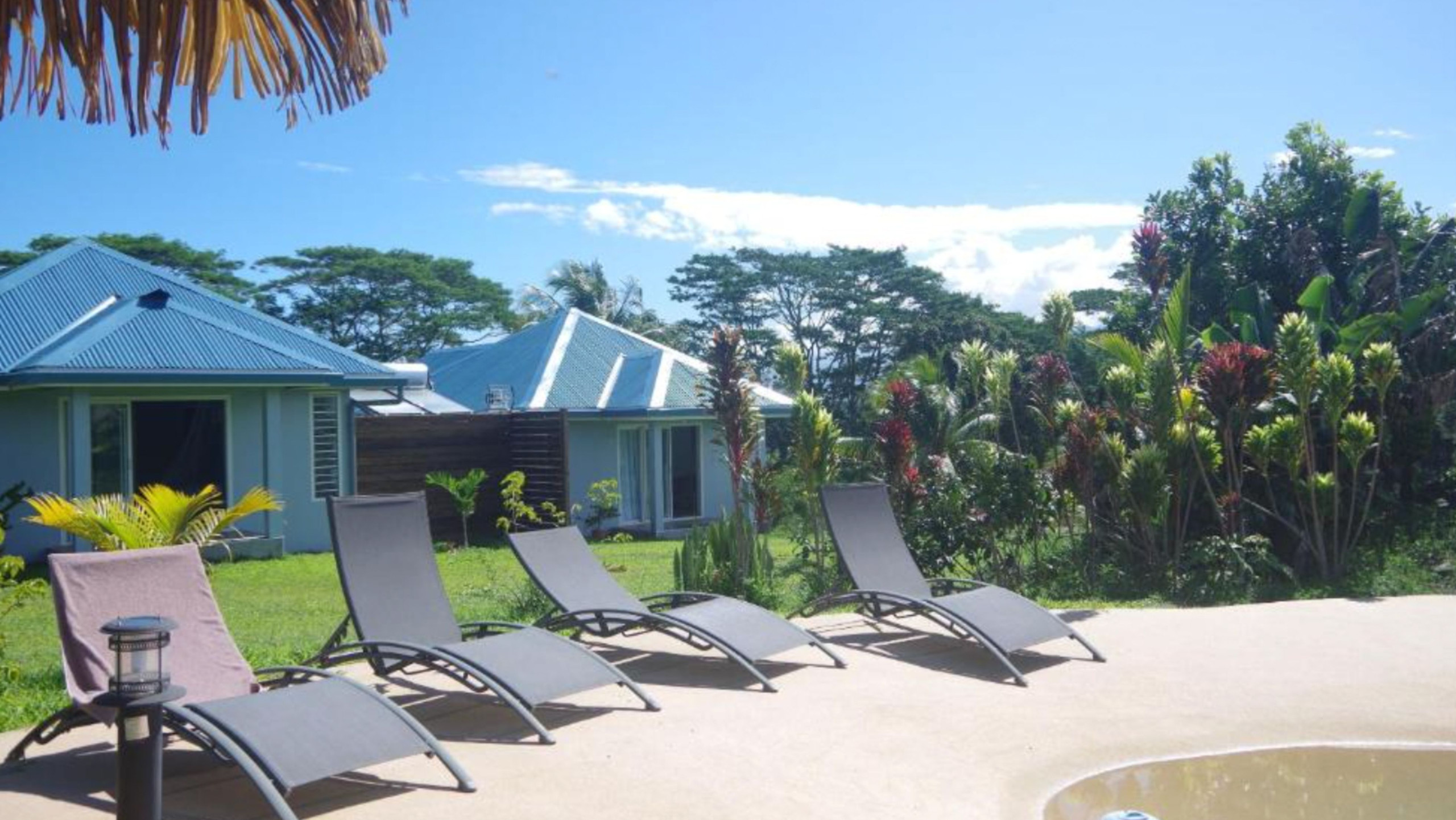 Accedes libremente a la piscina paisajística con cascada, así como al fare poté'e, un espacio acogedor que incluye salón, gran mesa y cocina de verano — ideal para compartir un momento con toda sencillez.