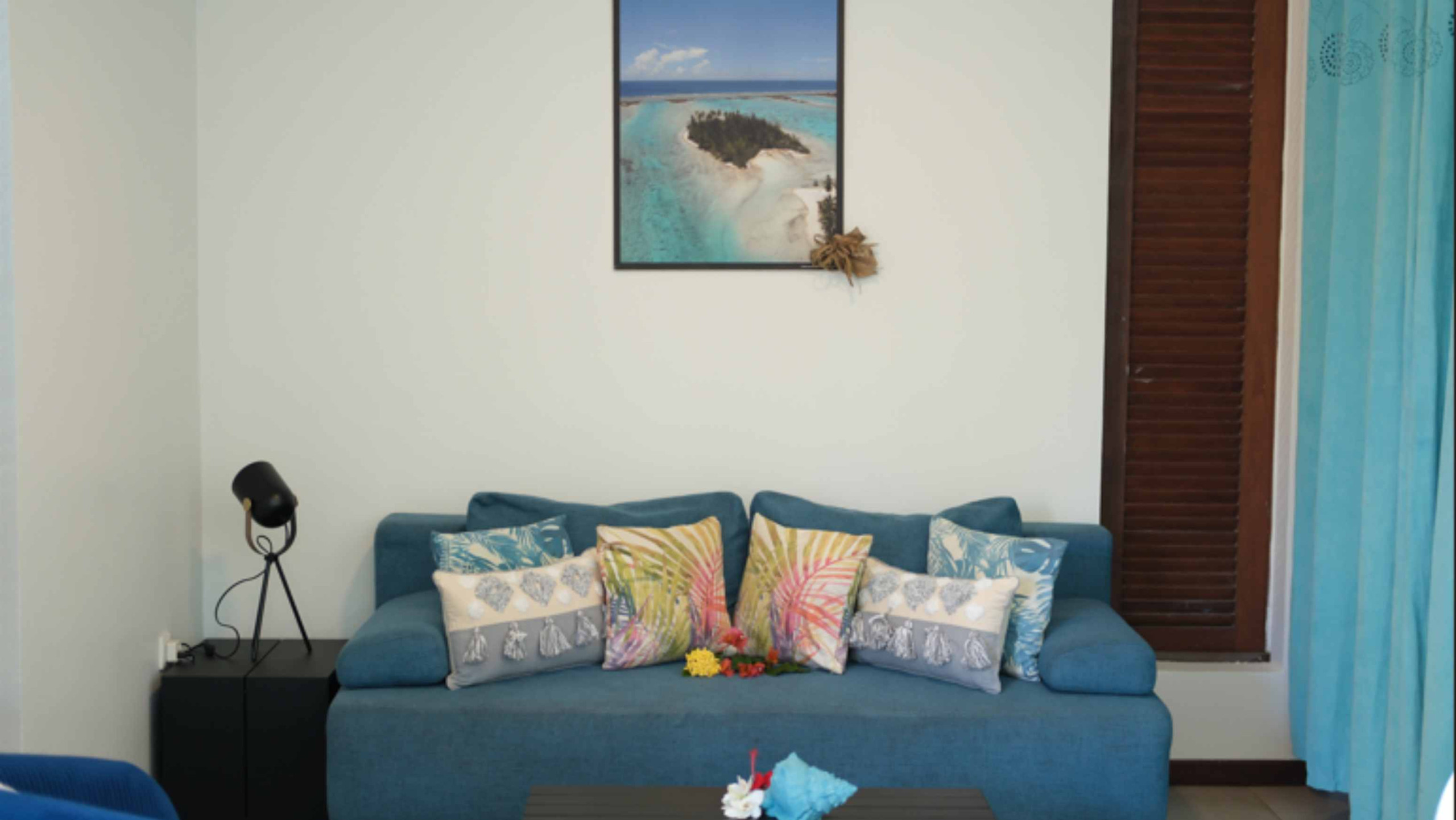 Los viajeros también tienen acceso a una piscina paisajística con cascada, así como al fare poté'e, un espacio acogedor que incluye salón, gran mesa en maru-maru y cocina de verano, accesible entre las 07:00 y las 21:00 horas.