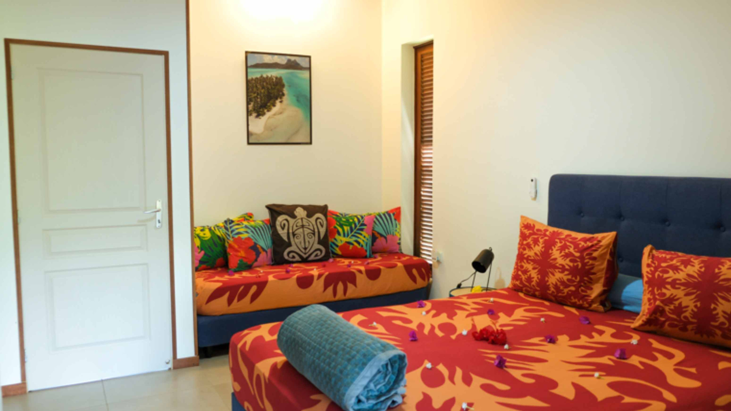 Su espacio interior luminoso está compuesto por una cama Queen Size, dos camas individuales, así como un sofá-cama individual, permitiendo un alojamiento cómodo para 5 viajeros. Toda la habitación está bien ventilada gracias a las persianas y los ventiladores que garantizan una circulación natural agradable.