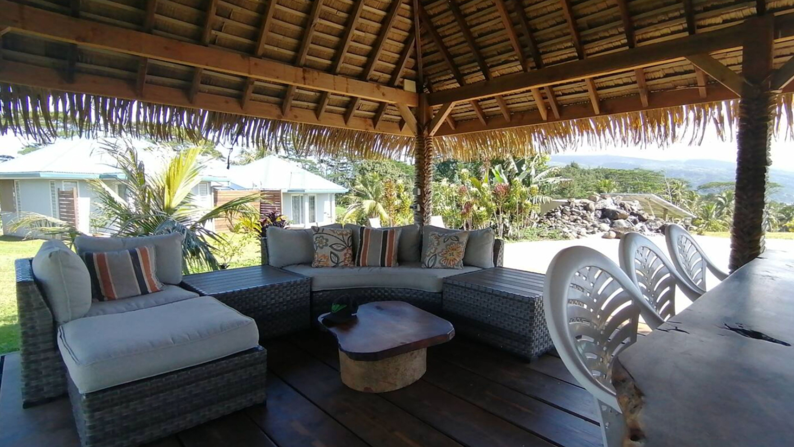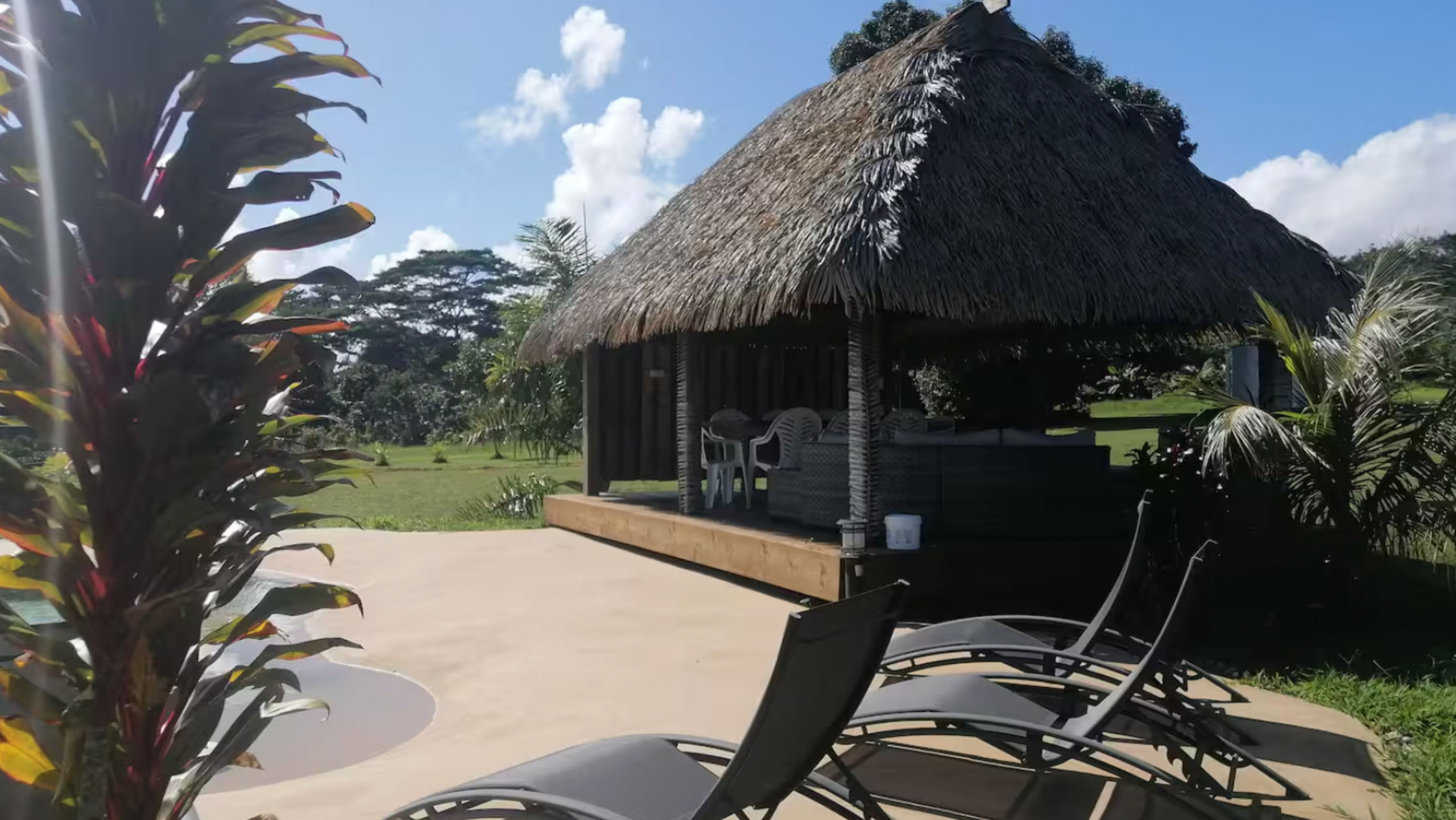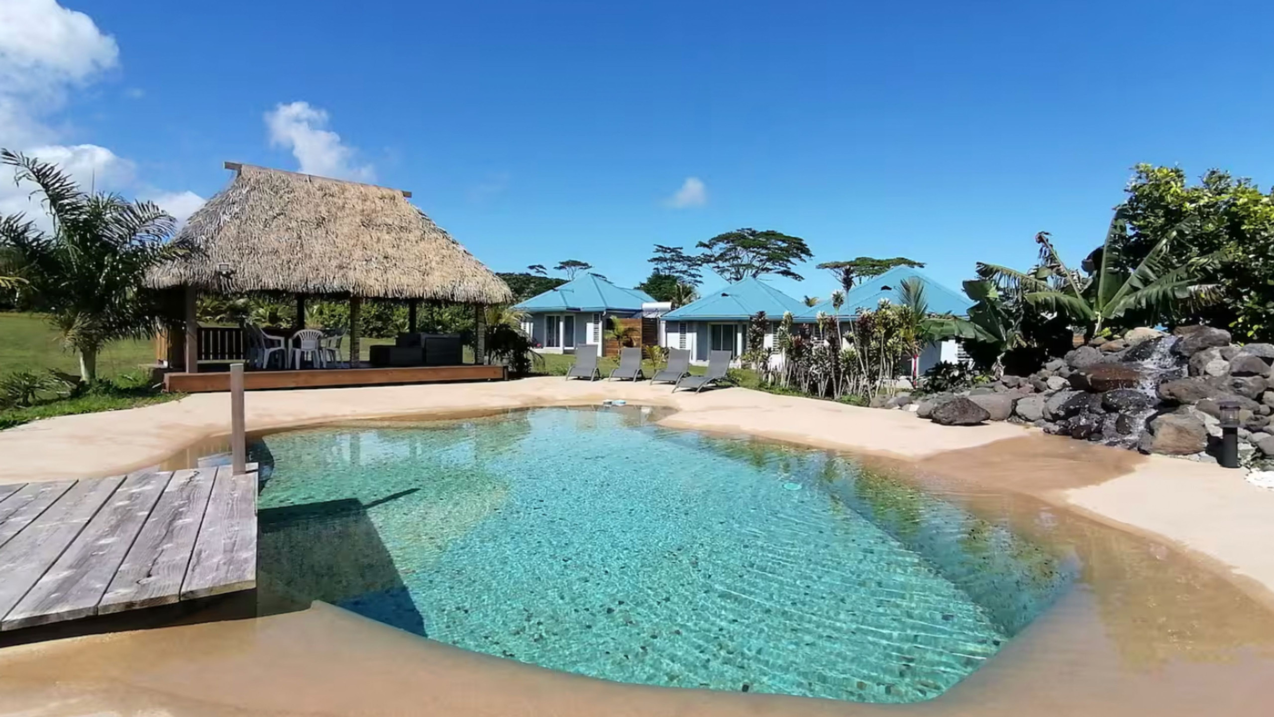 I viaggiatori hanno inoltre accesso a una piscina paesaggistica con cascata nonché al fare poté'e, uno spazio conviviale che comprende un salone, un grande tavolo in maru-maru e una cucina estiva, accessibile tra le 07:00 e le 21:00.