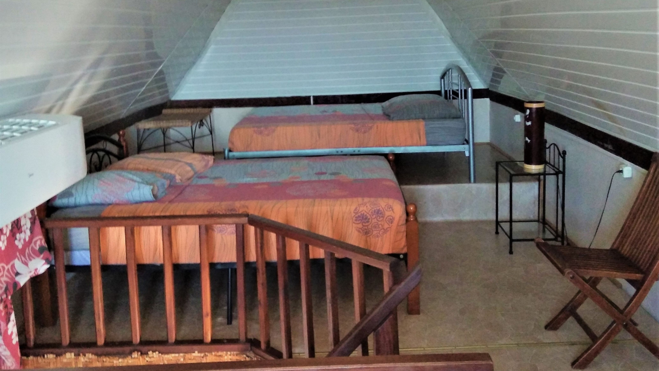 Al piano superiore, la mezzanina dispone di due letti matrimoniali, permettendo di accogliere comodamente diversi viaggiatori. Il bagno privato si trova al piano terra e comprende doccia, lavabo e WC.