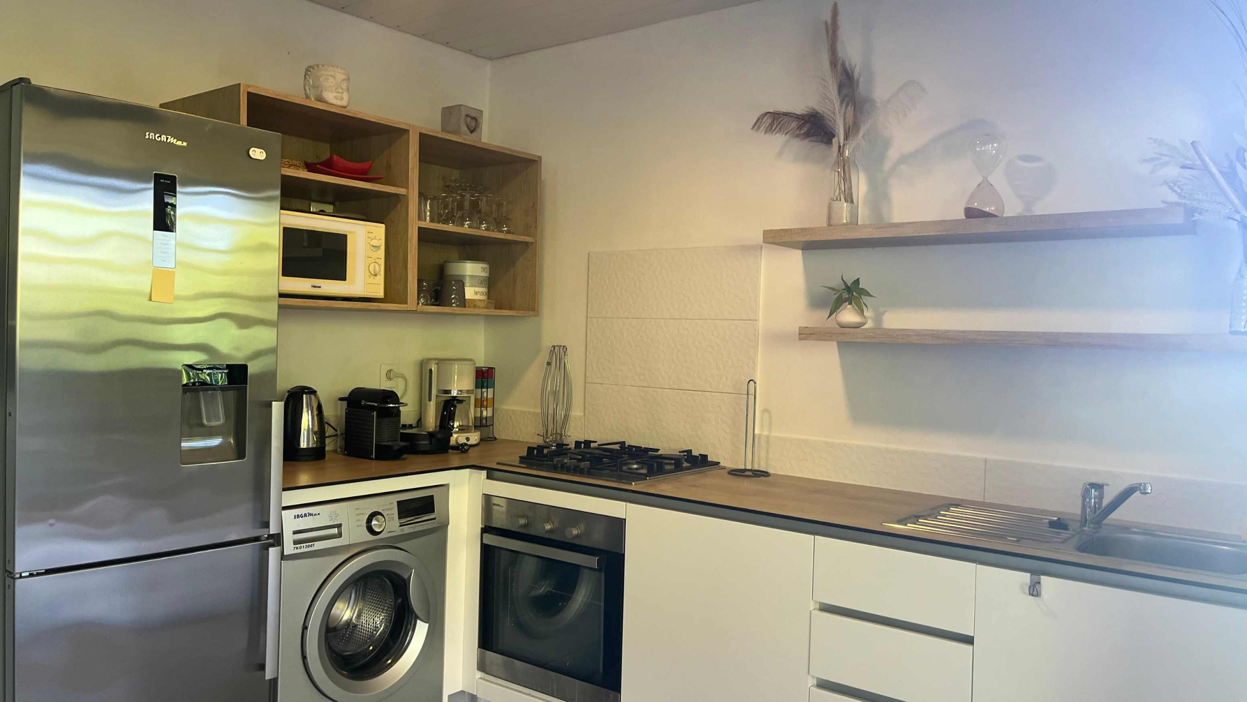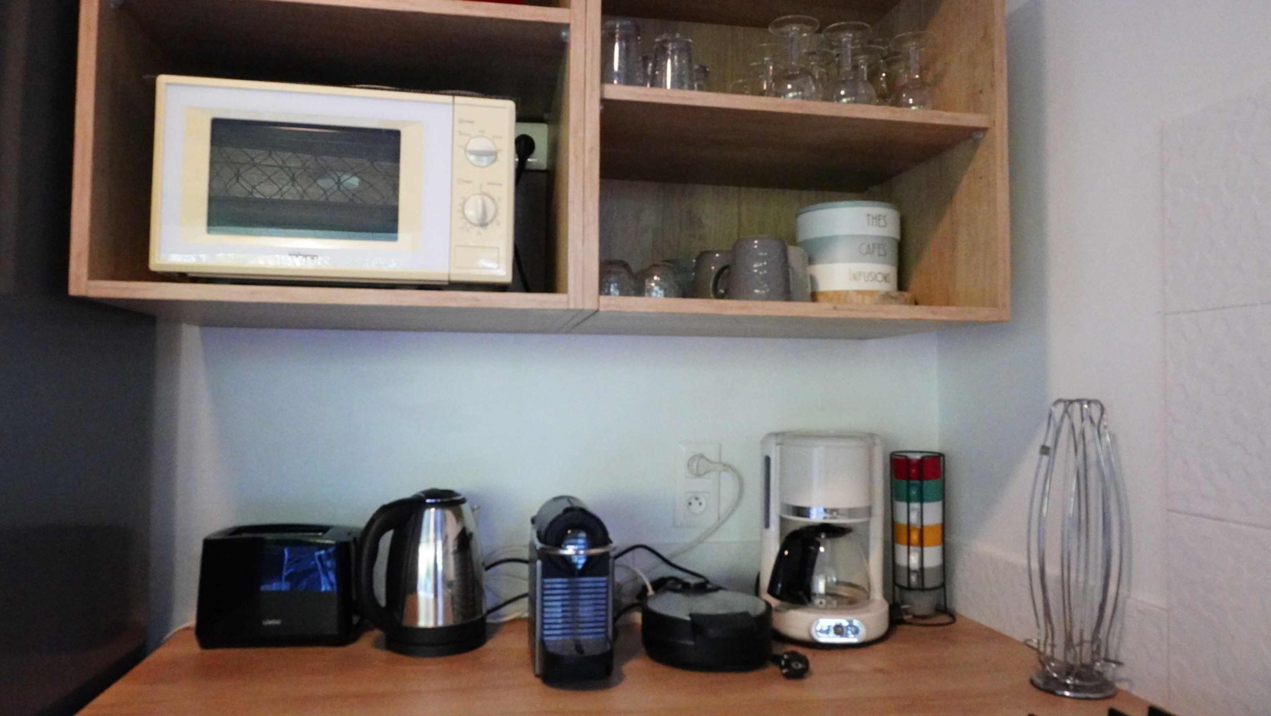 1 cucina completamente attrezzata: frigorifero, forno, microonde, tostapane, macchina da caffè e bollitore elettrico – tutto il necessario per preparare i pasti a casa.