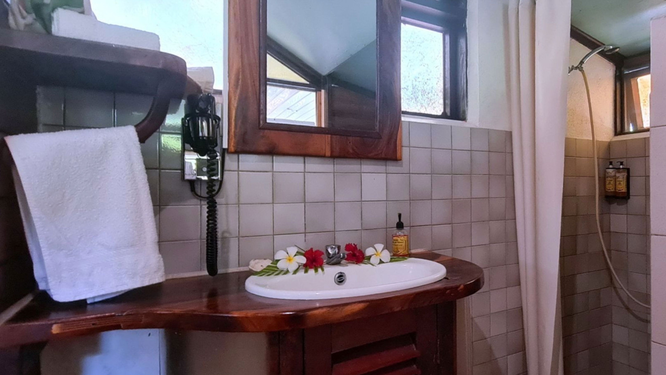 La salle de bain privative, intégrée au bungalow, comprend une douche et des toilettes.