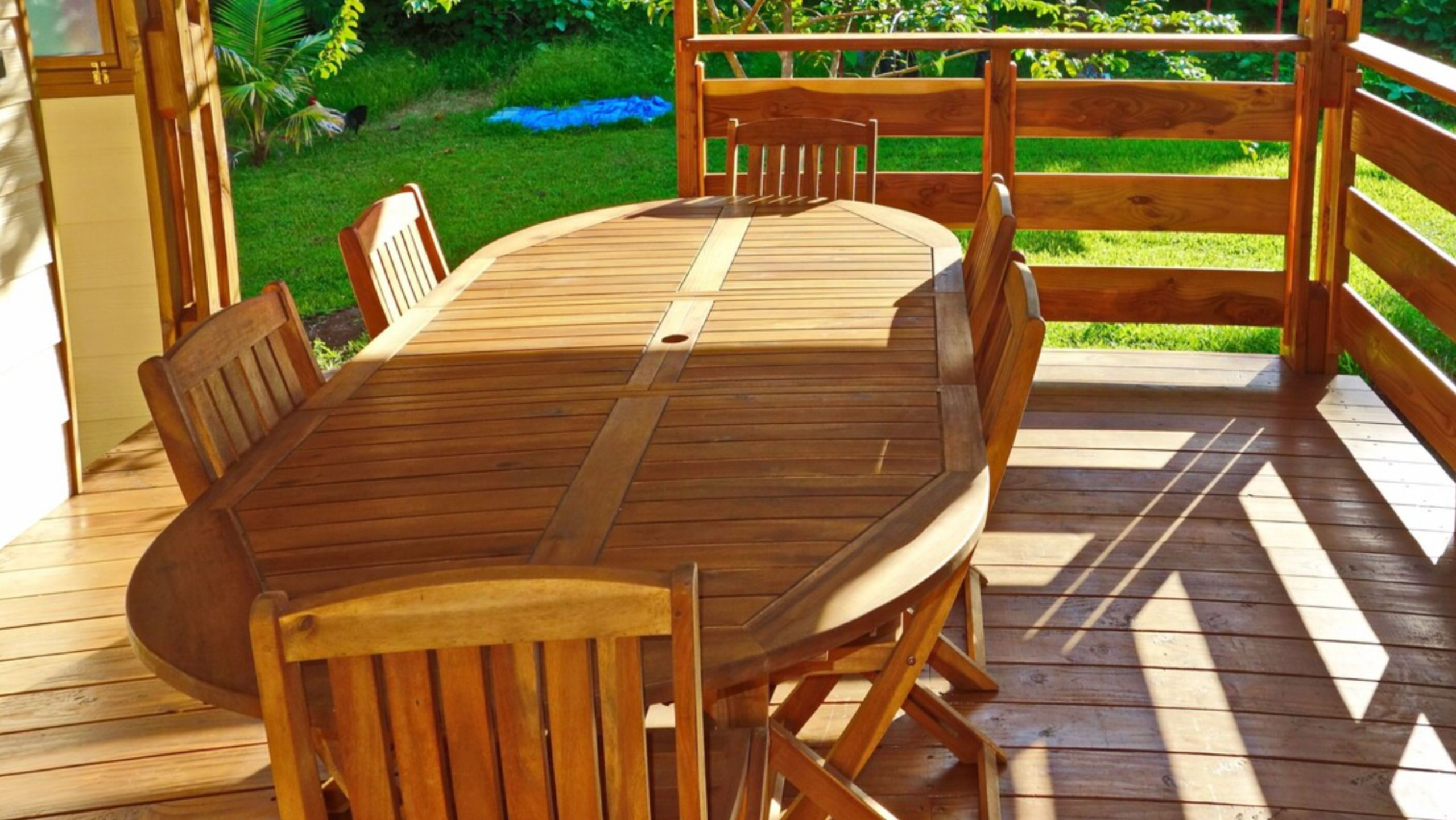 La terrasse couverte, équipée de mobilier en teck, offre un espace agréable pour partager un repas ou simplement se détendre, avec vue sur le jardin.