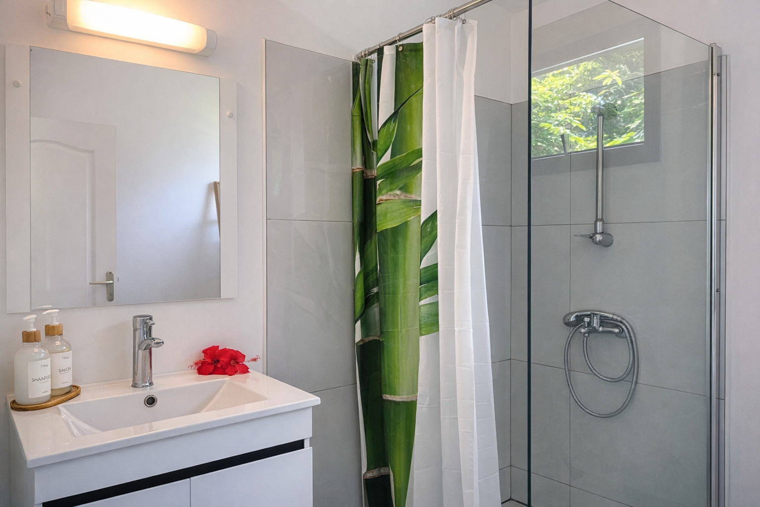La salle de bain est équipée d’une douche à l’italienne, d’un lavabo et de toilettes. Vous aurez également accès à un lave-linge et un sèche-cheveux.