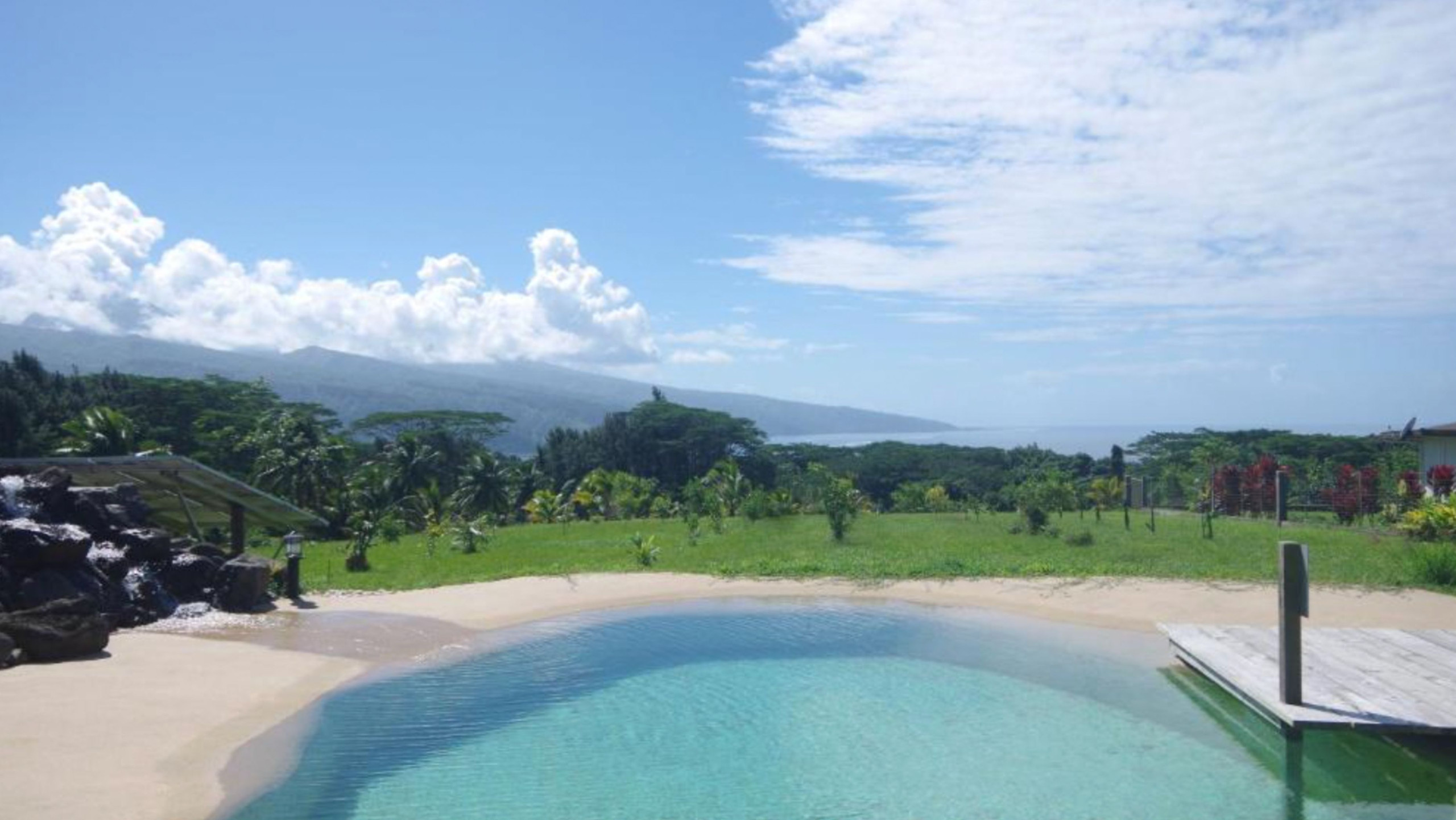 Vous accédez librement à la piscine paysagée avec cascade, ainsi qu’au fare poté’e, un espace convivial comprenant salon, grande table et cuisine d’été — idéal pour partager un moment en toute simplicité.