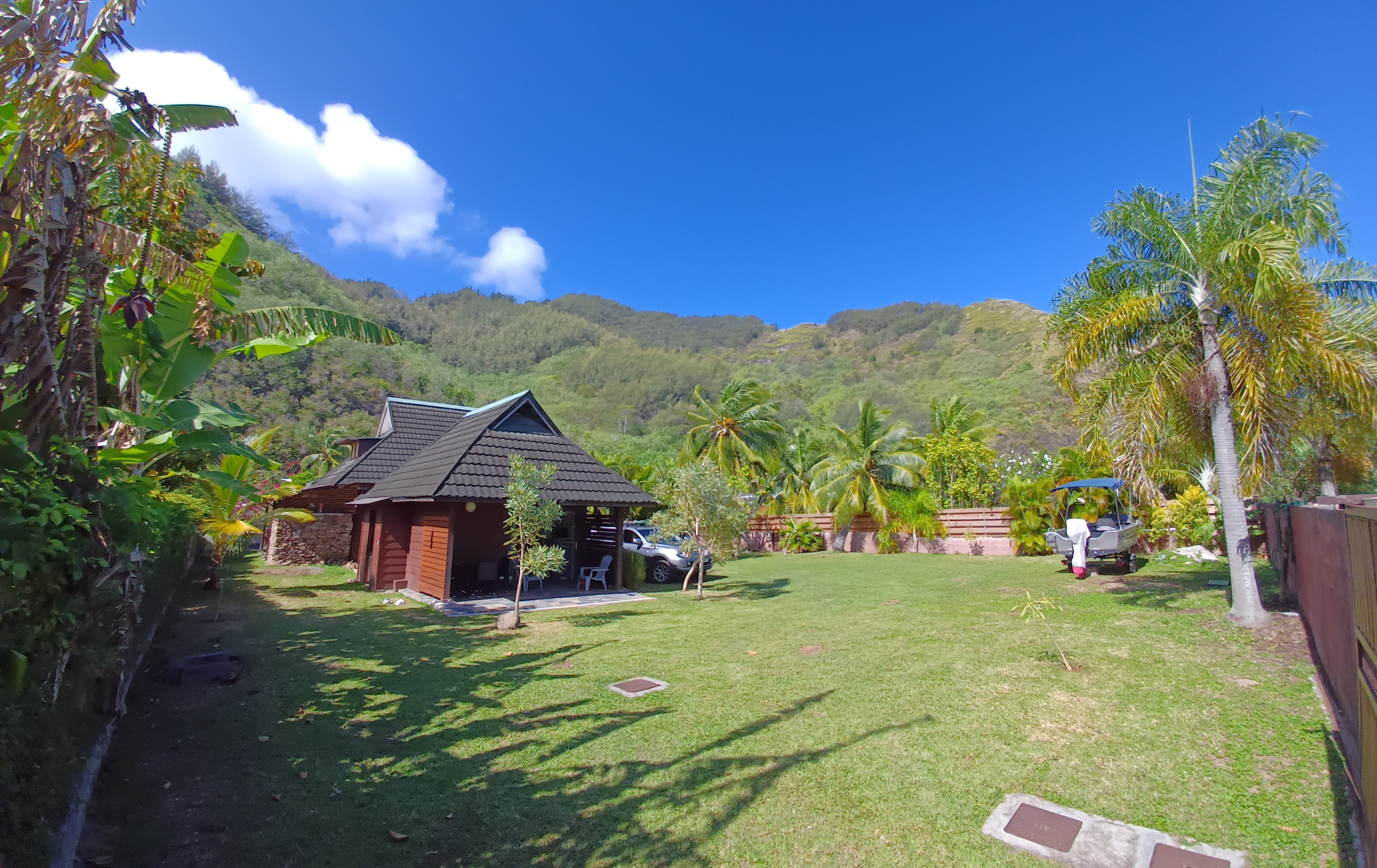 Le grand jardin clos et luxuriant sera le lieu idéal pour les activités de plein air : badminton, jeu de quilles, ou journées farniente sous le fare potee.