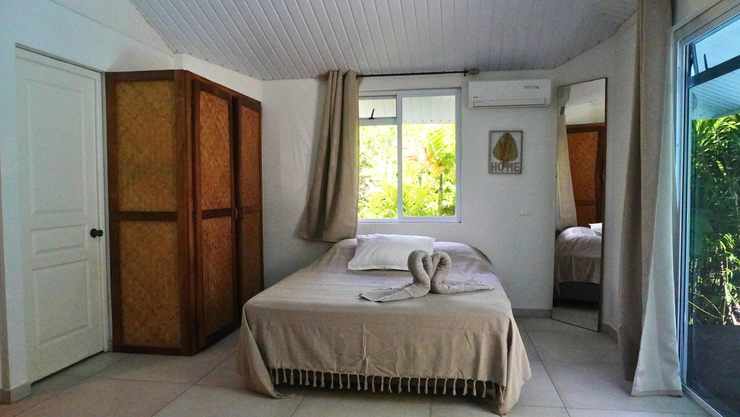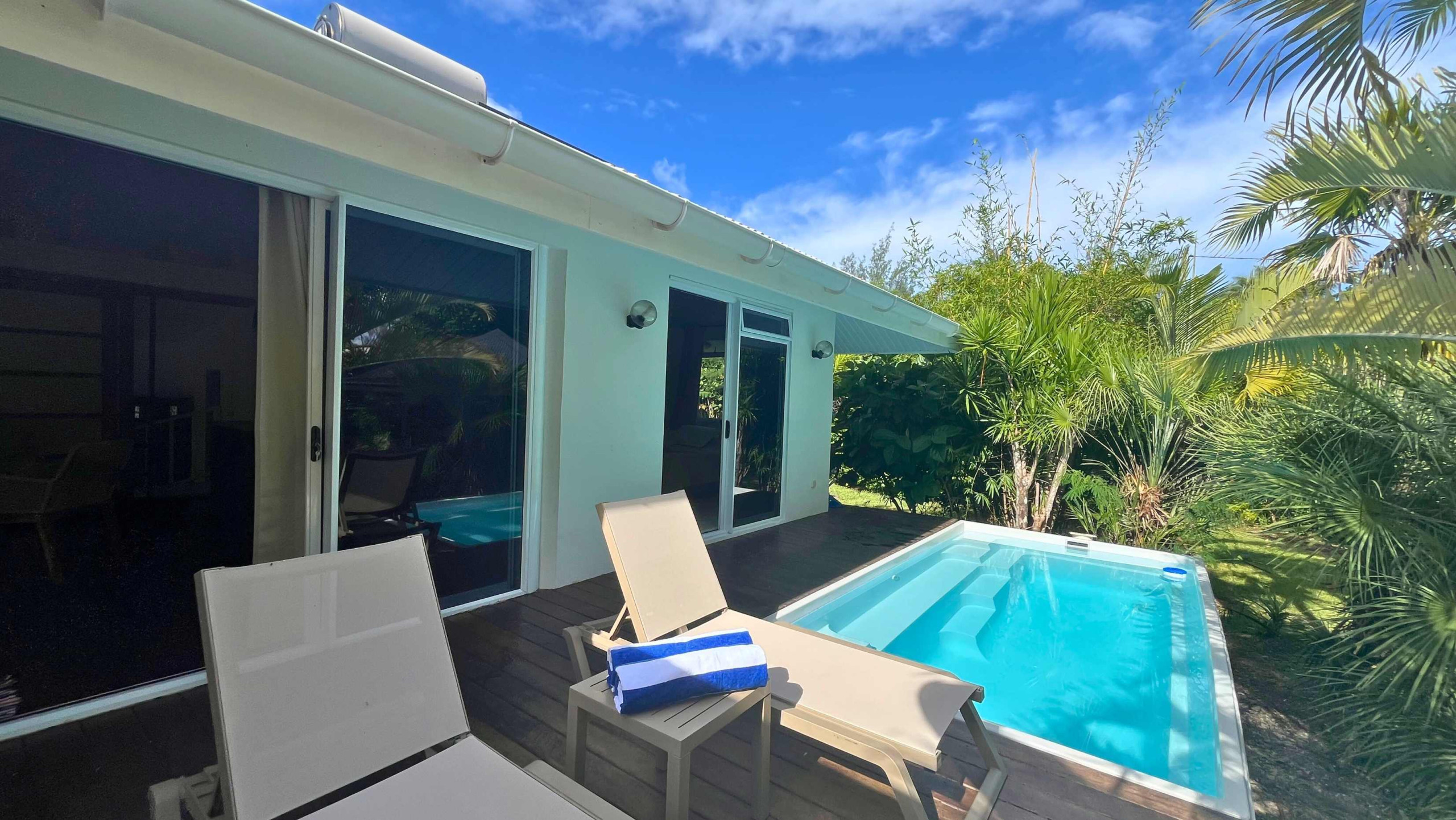 D’une superficie de 150 m², la maison et le bungalow attenant dispose de 2 chambres climatisées avec 2 lits king size dans la maison et 1 chambre climatisée avec lit queen size avec salle de bain attenante dans le bungalow.