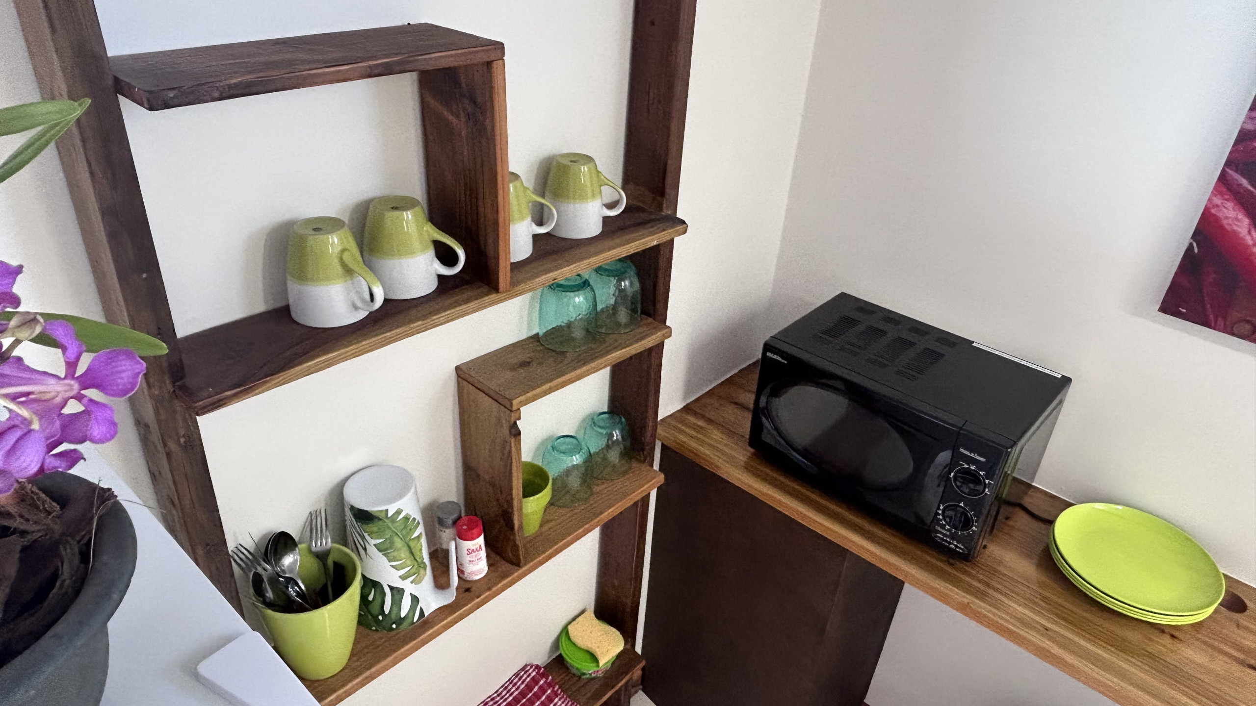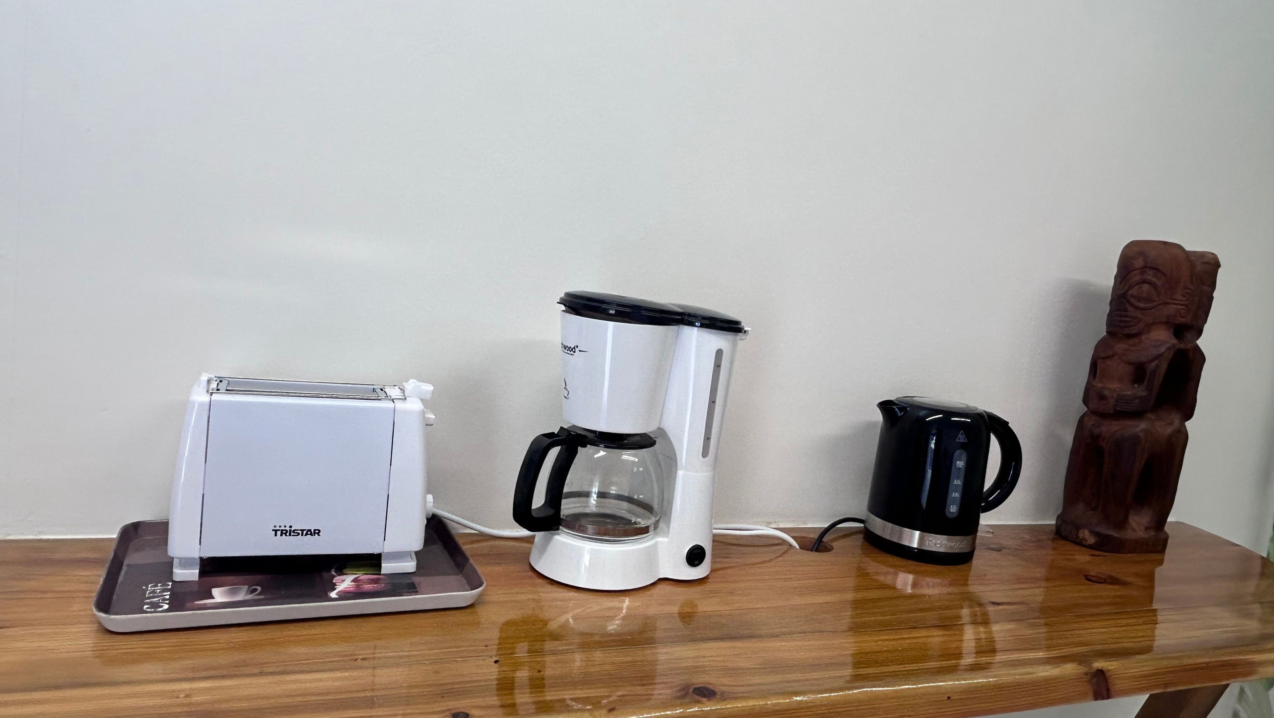 Une kitchenette fonctionnelle équipée d’un réfrigérateur, micro-ondes, bouilloire, cafetière et grille-pain, idéale pour préparer de petits-déjeuners ou encas.