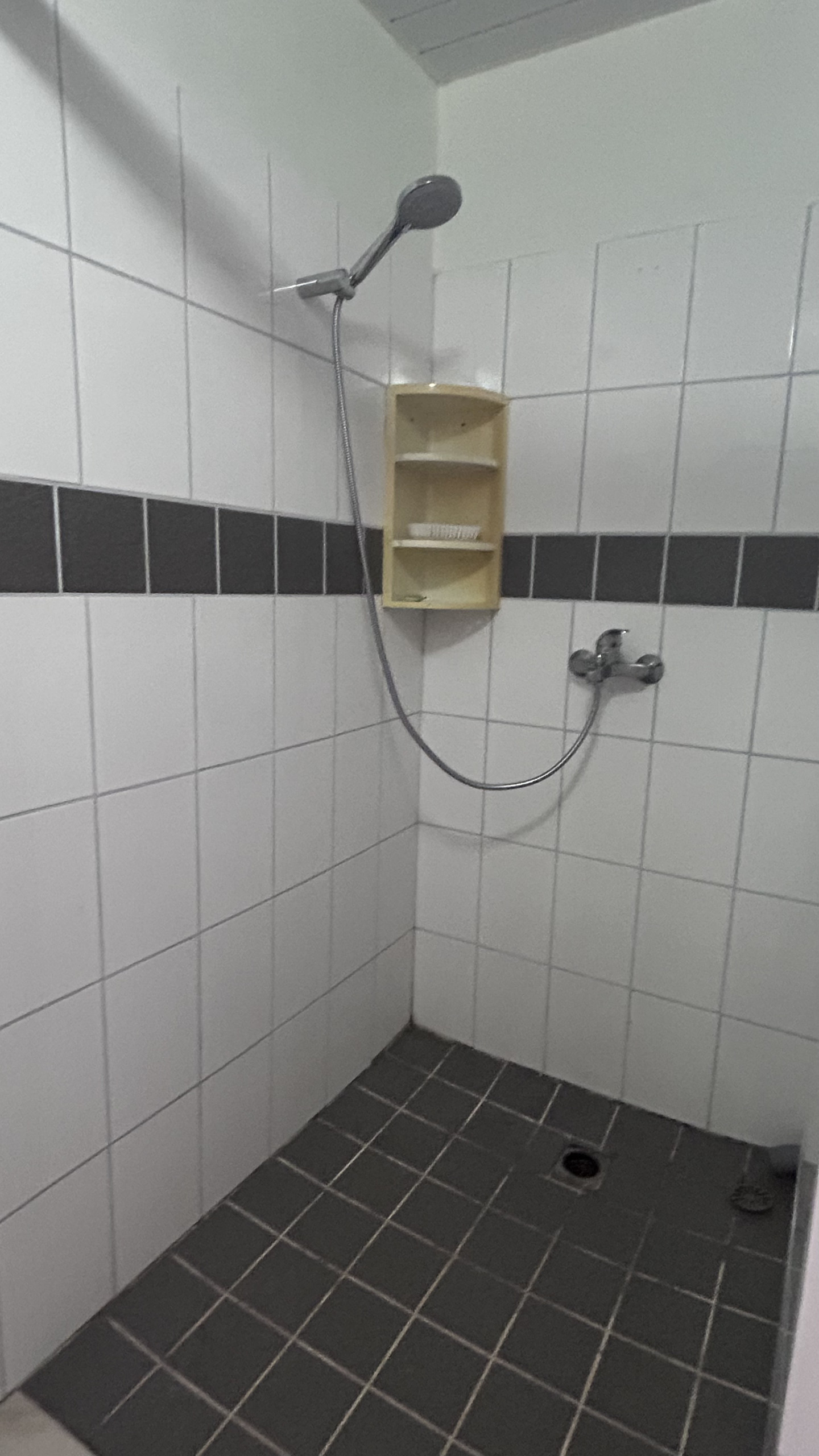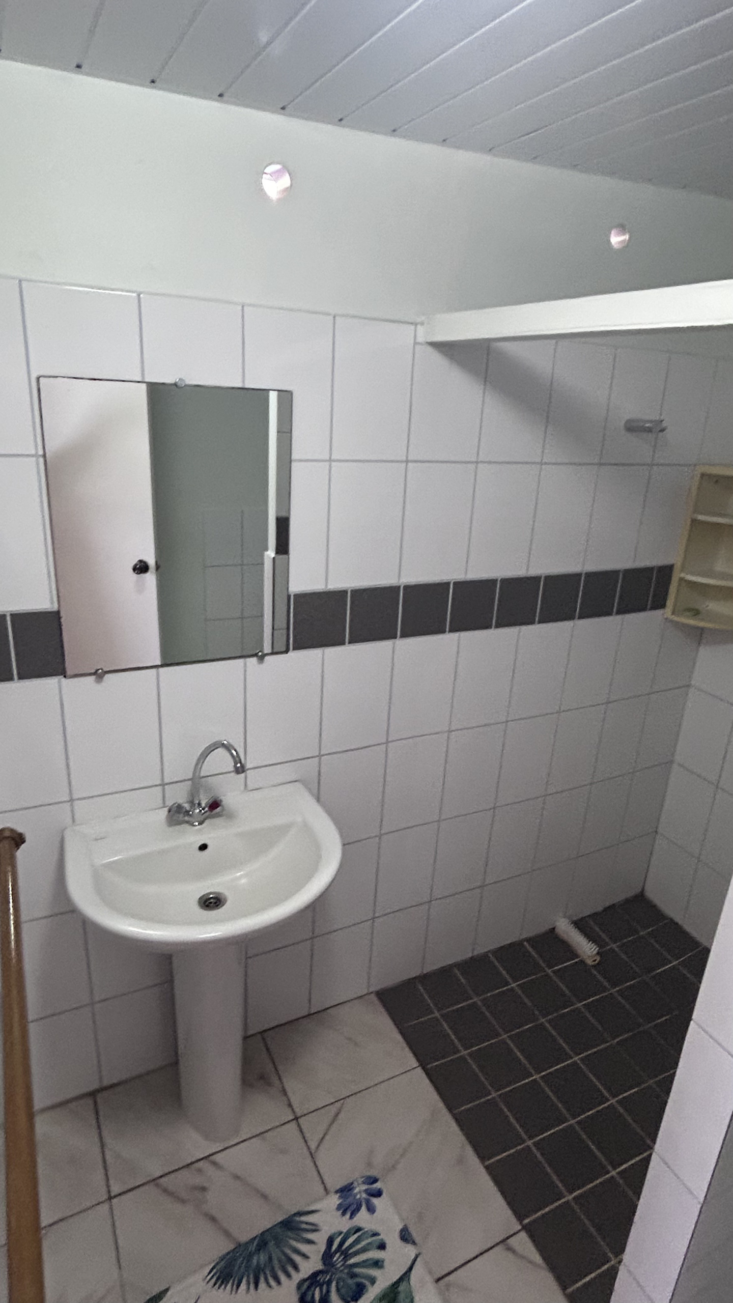 Une salle de bain avec douche à l’italienne, lavabo et WC.