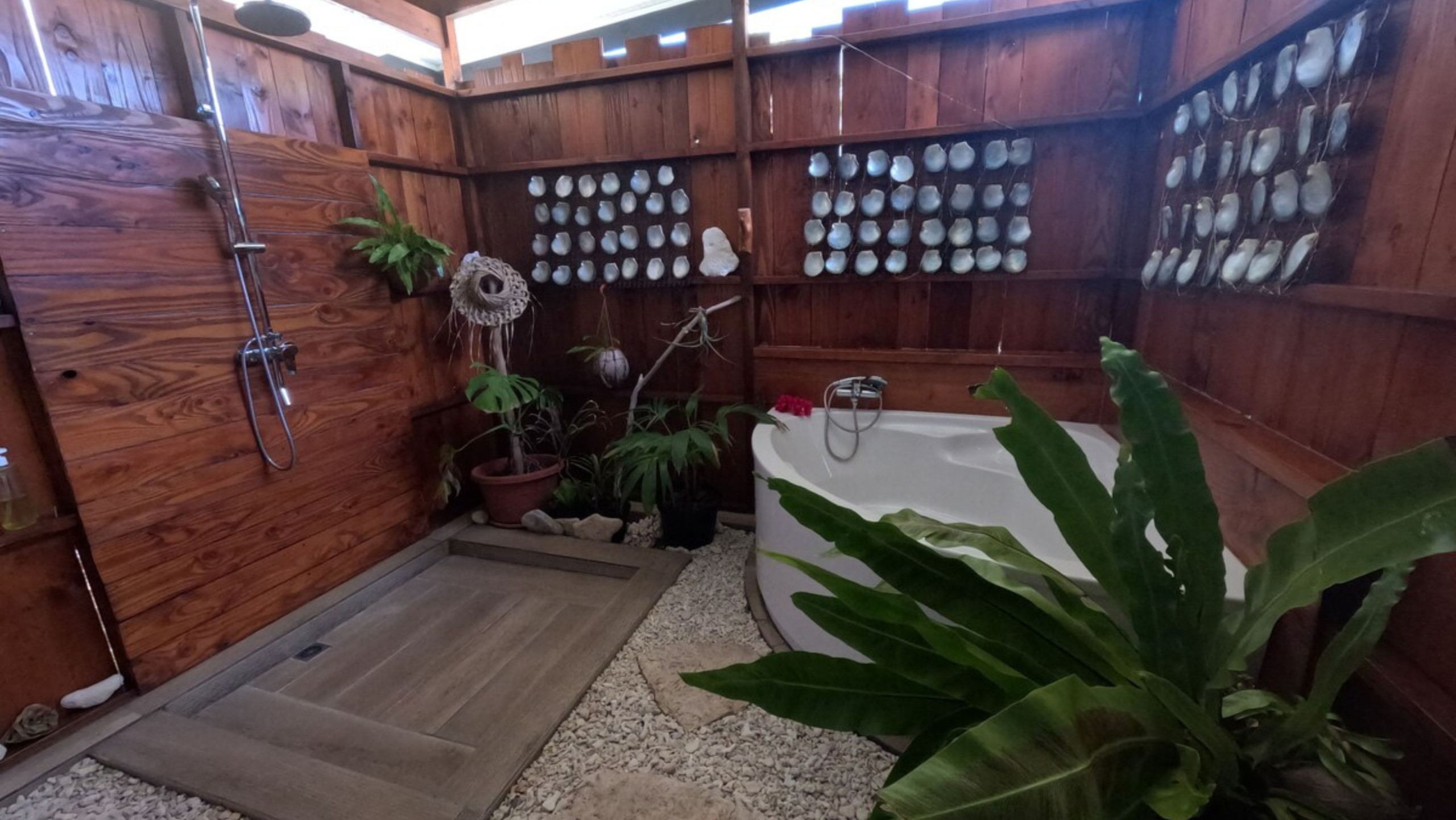 Salle de bain tropicale semi-ouverte (douche + baignoire)