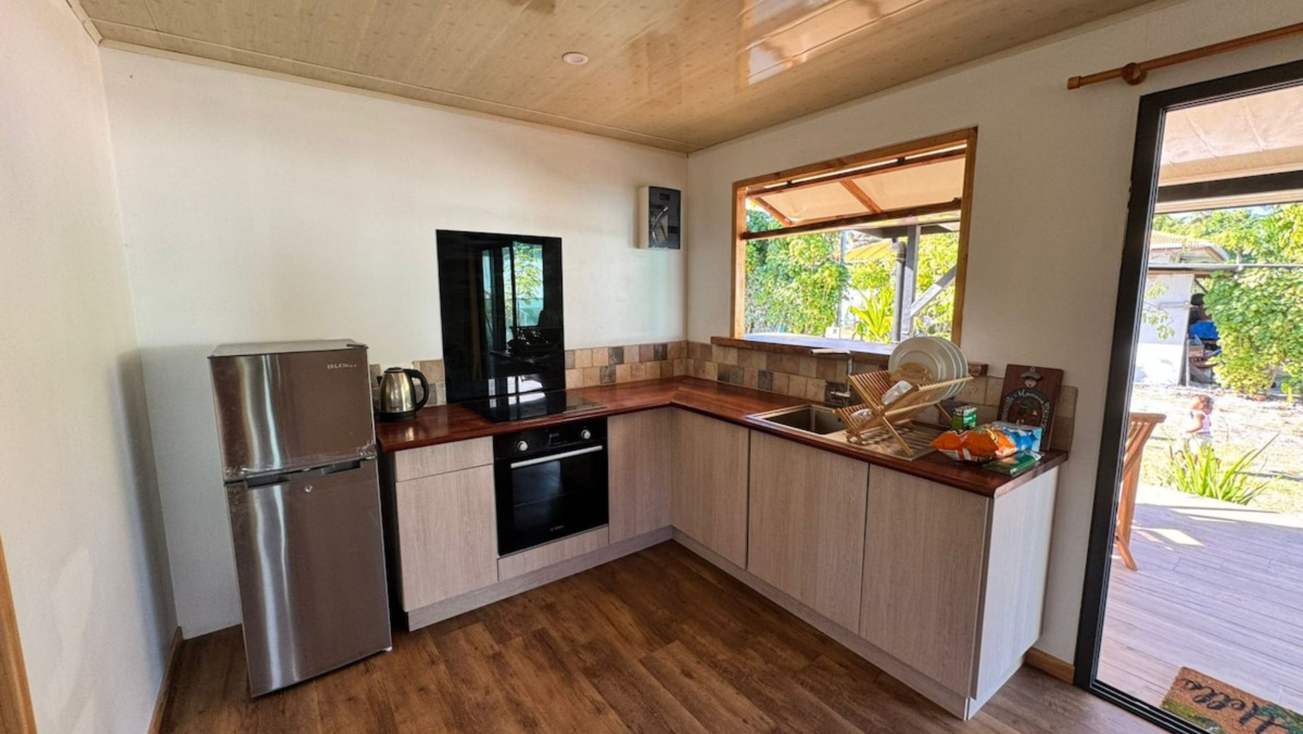 Le bungalow peut accueillir 2 adultes et 2 enfants. Il comprend un lit queen size, un canapé-lit double, une salle de bain moderne avec douche et toilettes, ainsi qu’une kitchenette équipée pour préparer vos repas en toute autonomie. À l’extérieur, une petite terrasse permet de partager vos repas ou de profiter de la douceur des soirées polynésiennes.