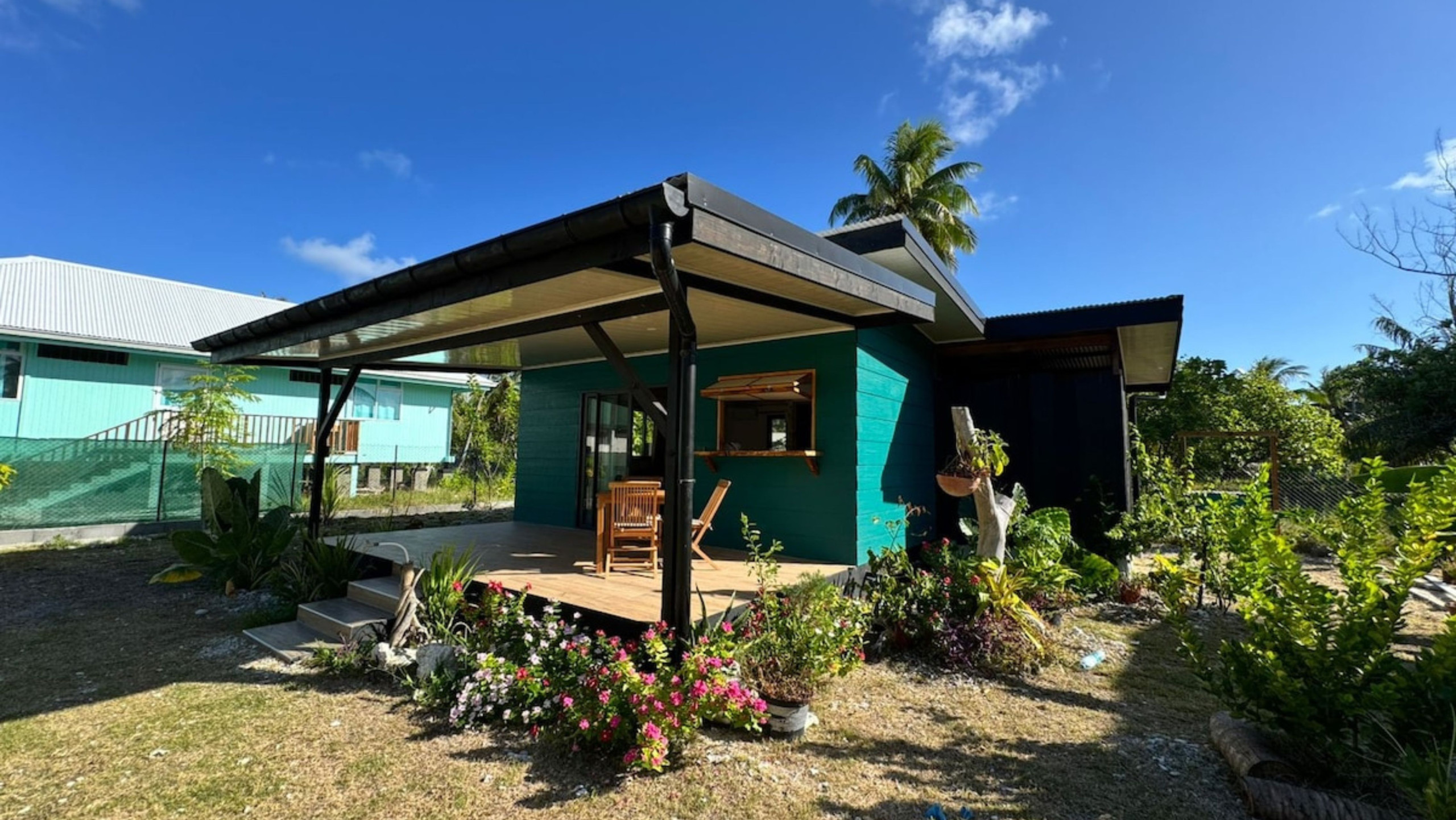 Le cœur du logement est son grand patio local attenant, esprit fare pote'e, idéal pour prendre vos repas, vous relaxer et profiter du jardin tropical qui entoure la propriété.