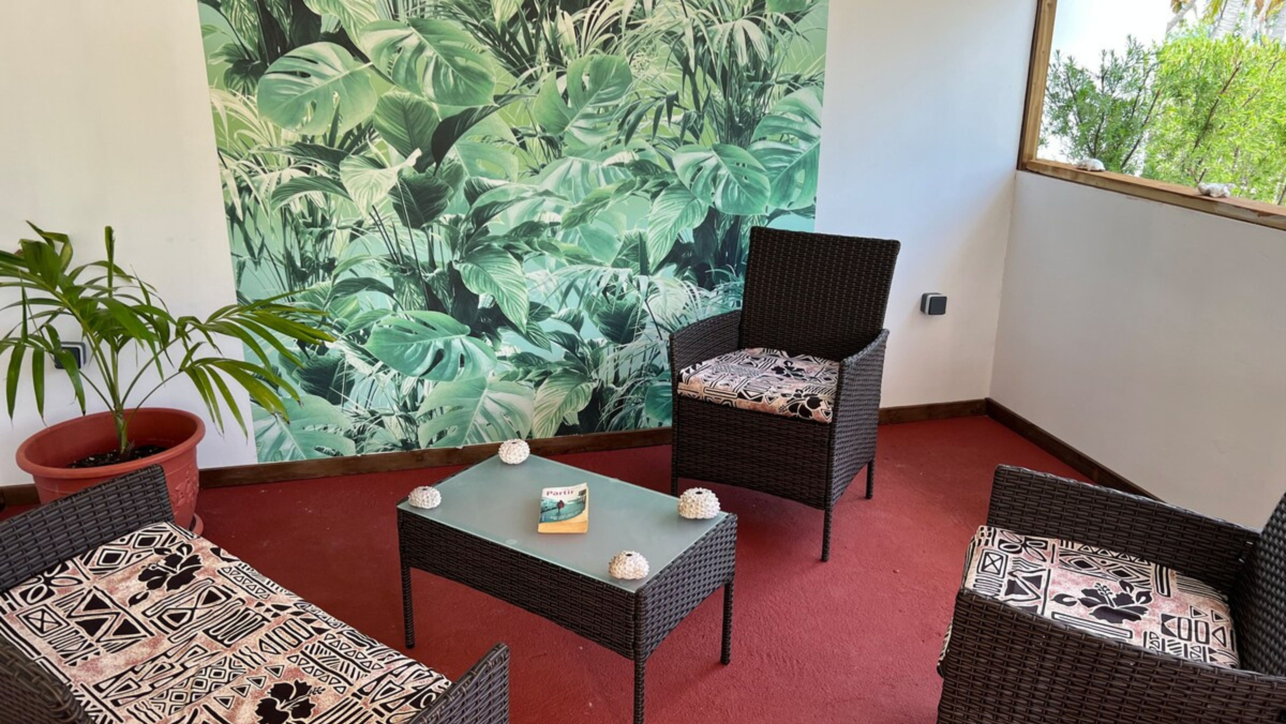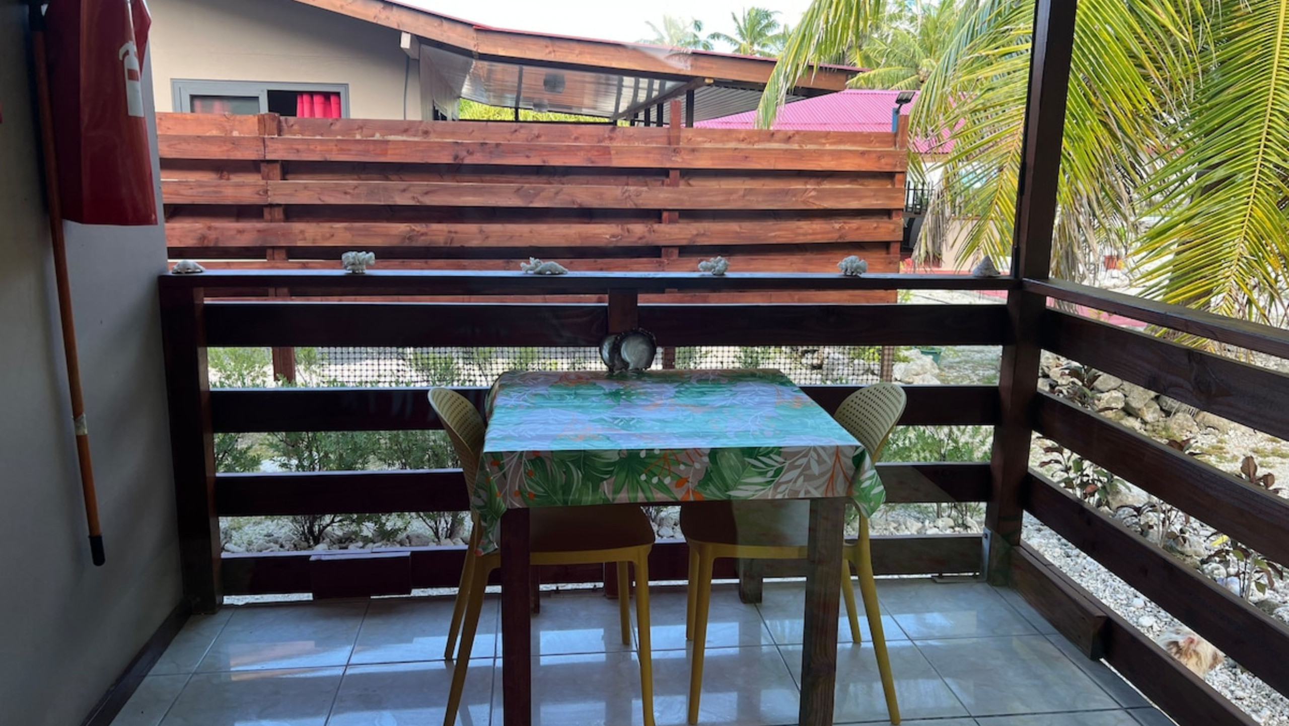 Une terrasse couverte avec une vue imprenable sur le lagon, parfaite pour se détendre ou savourer un café face au lever du soleil