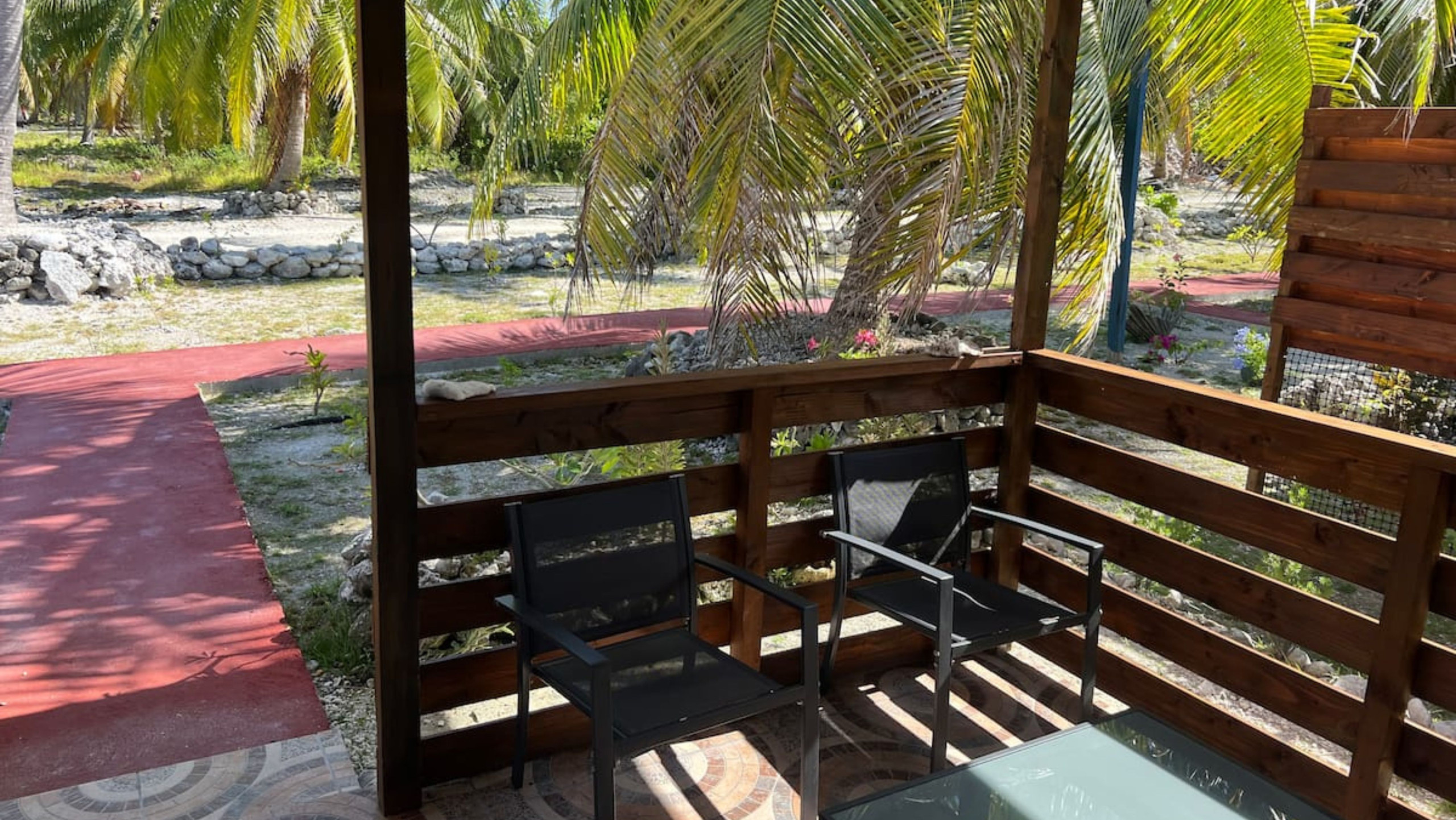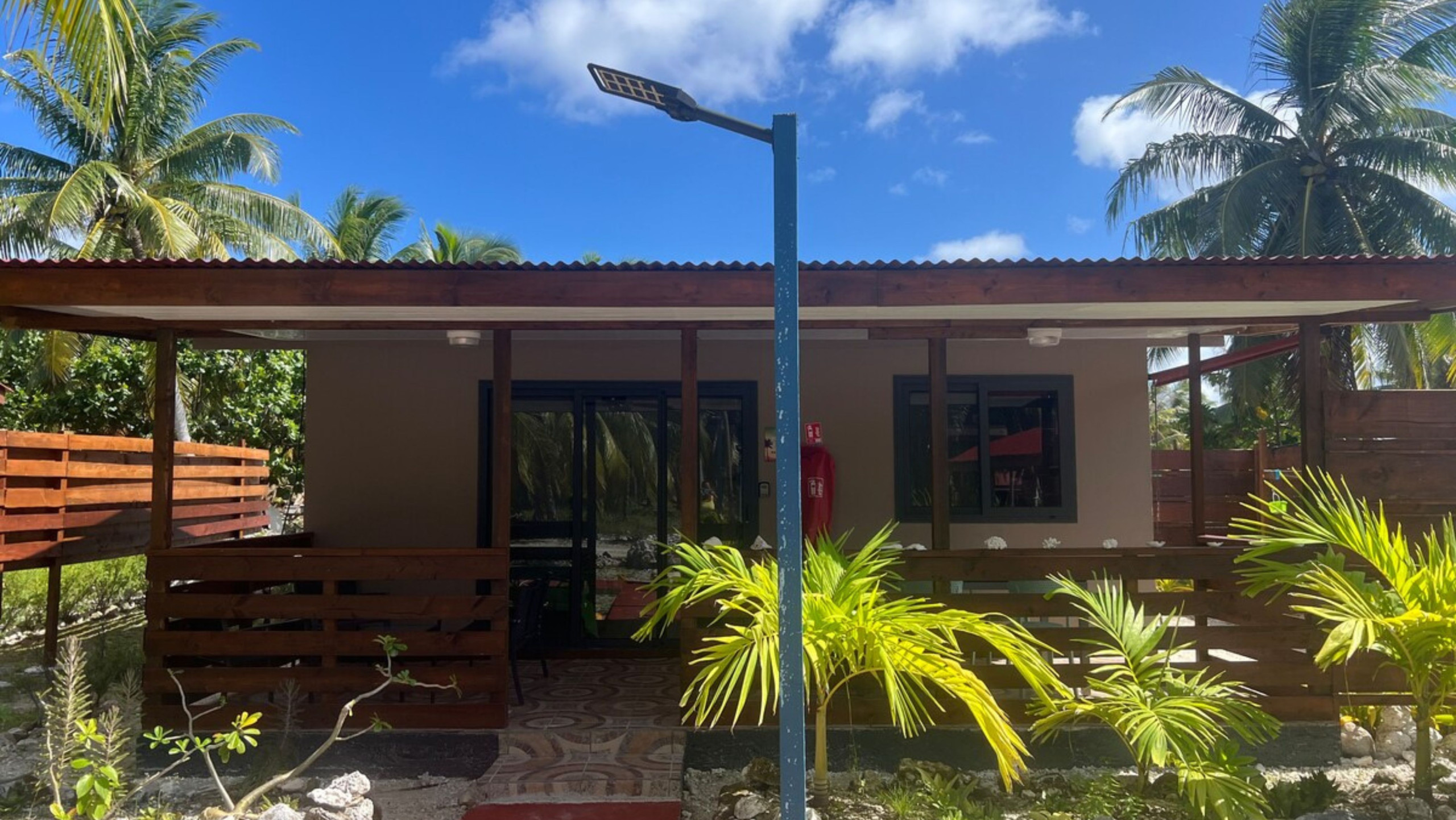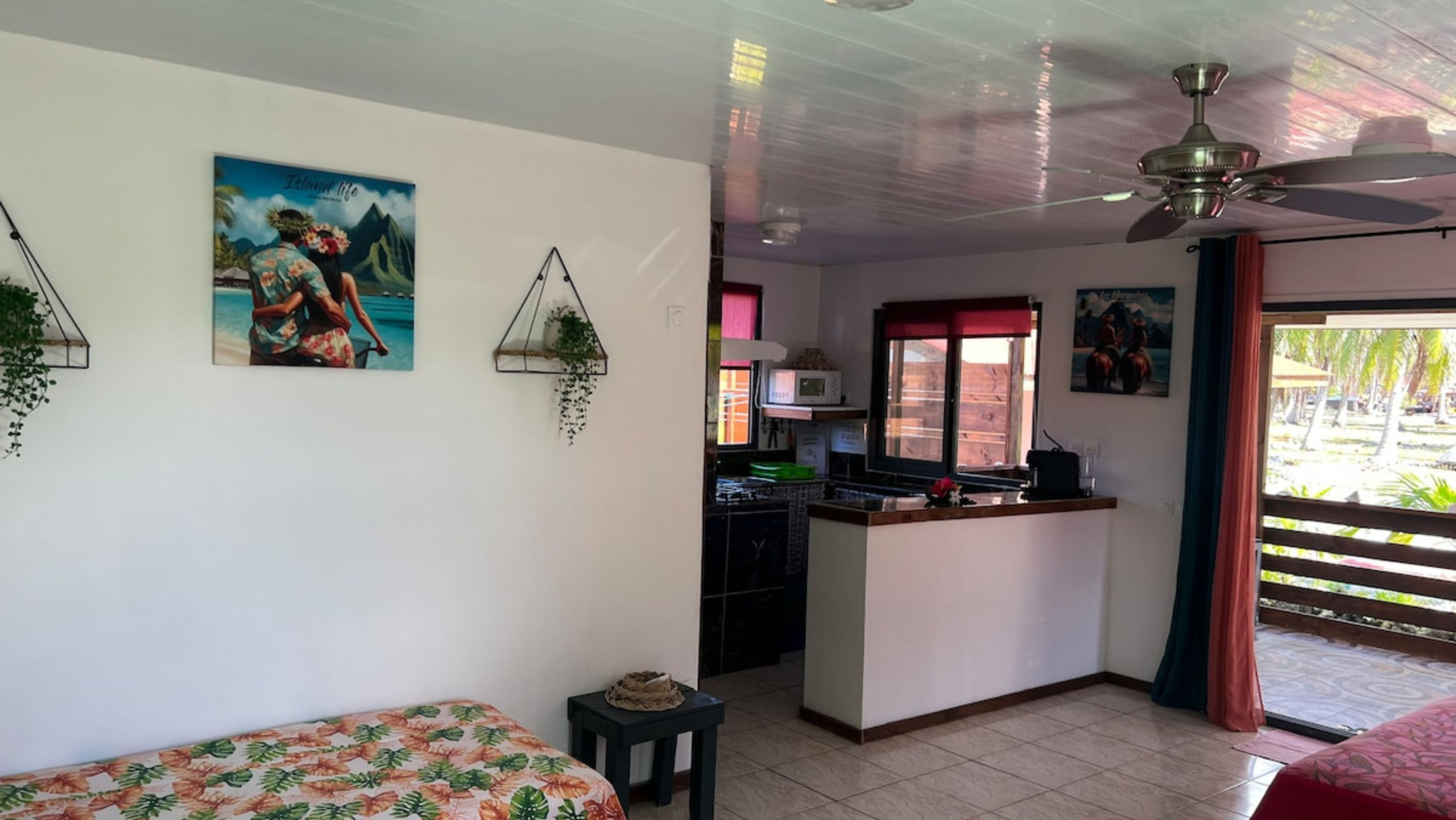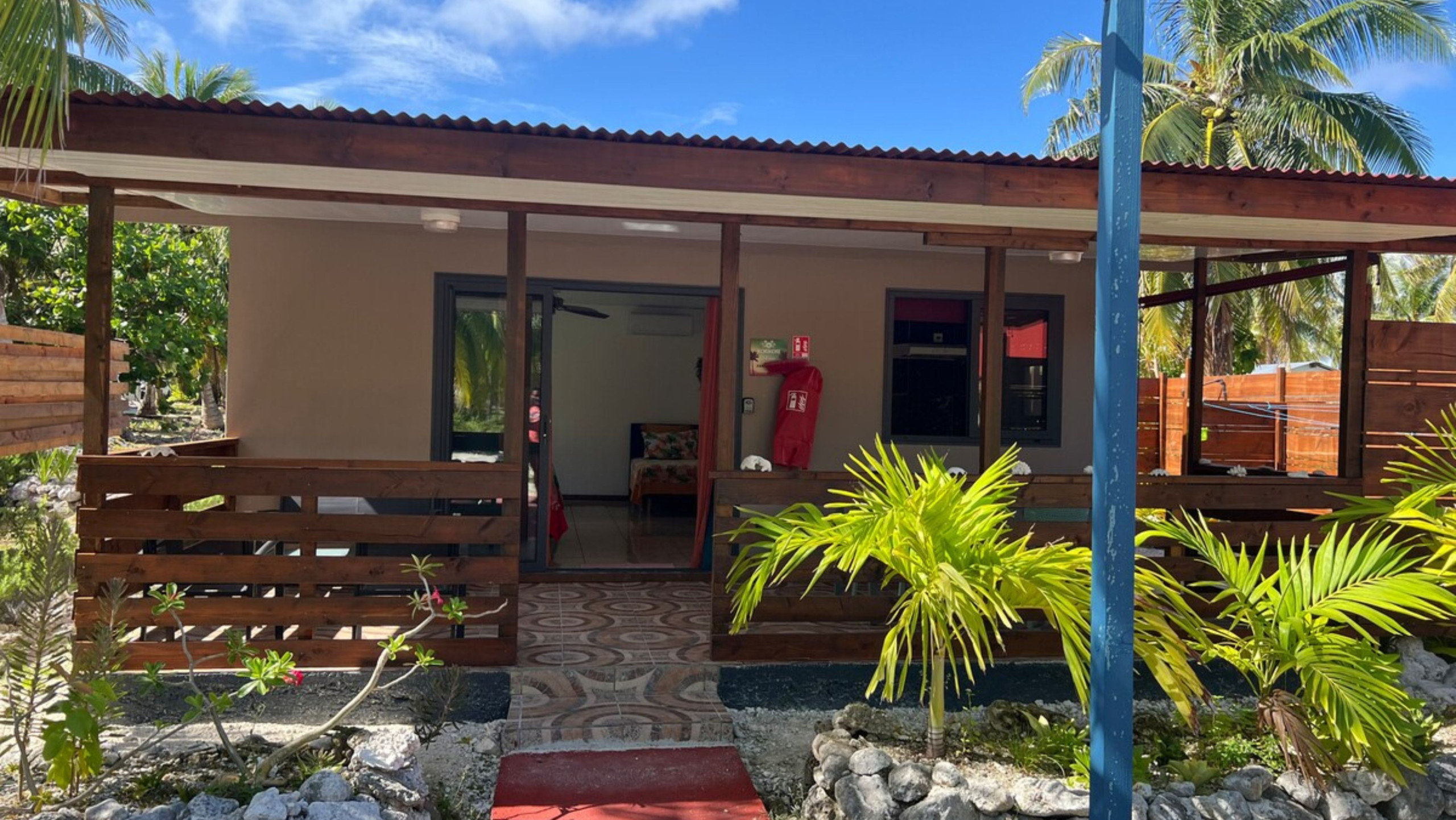 Le logement accueille jusqu’à 5 personnes et dispose d’un espace chambre avec deux lits queen-size et un lit simple. La grande terrasse couverte est parfaite pour partager un repas, se détendre après une journée au lagon ou simplement savourer la tranquillité de l’île. Vous trouverez une salle de bain intérieure avec eau chaude, complétée par une douche extérieure pratique au retour de la plage. La cuisine aménagée permet de préparer vos repas en toute autonomie, et le bungalow est équipé d’un wifi, d’une machine à laver et d’un coin étendoir pour plus de confort.