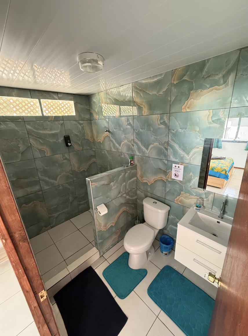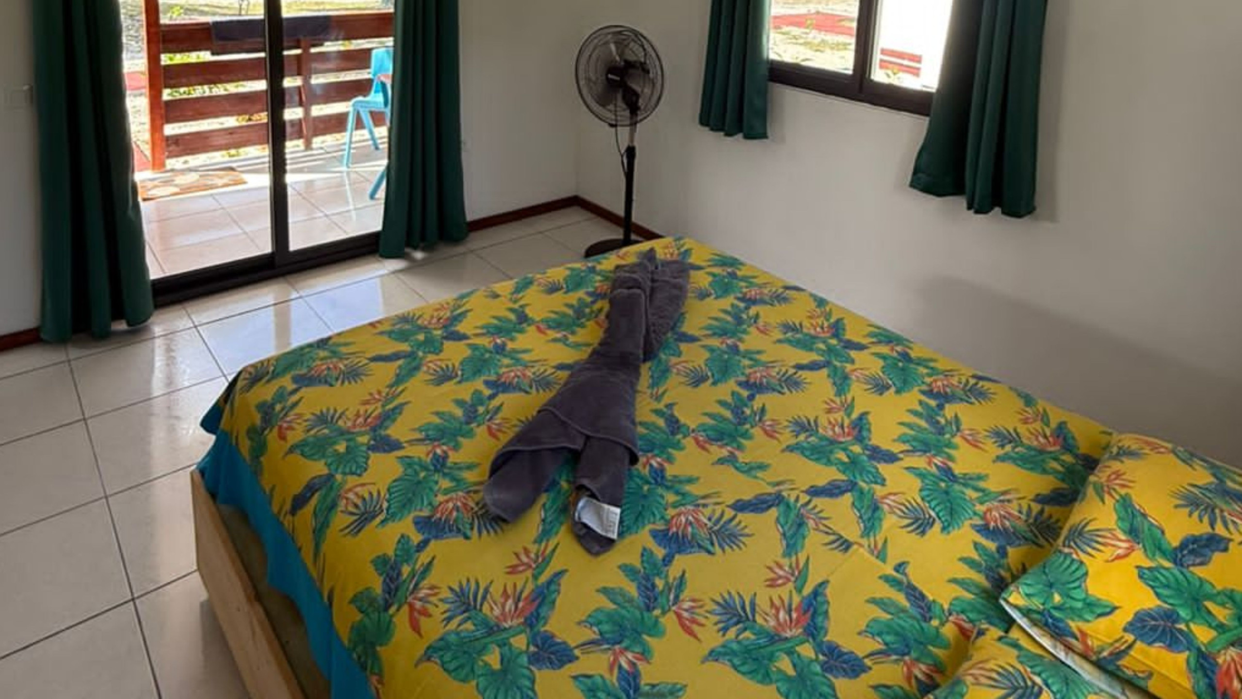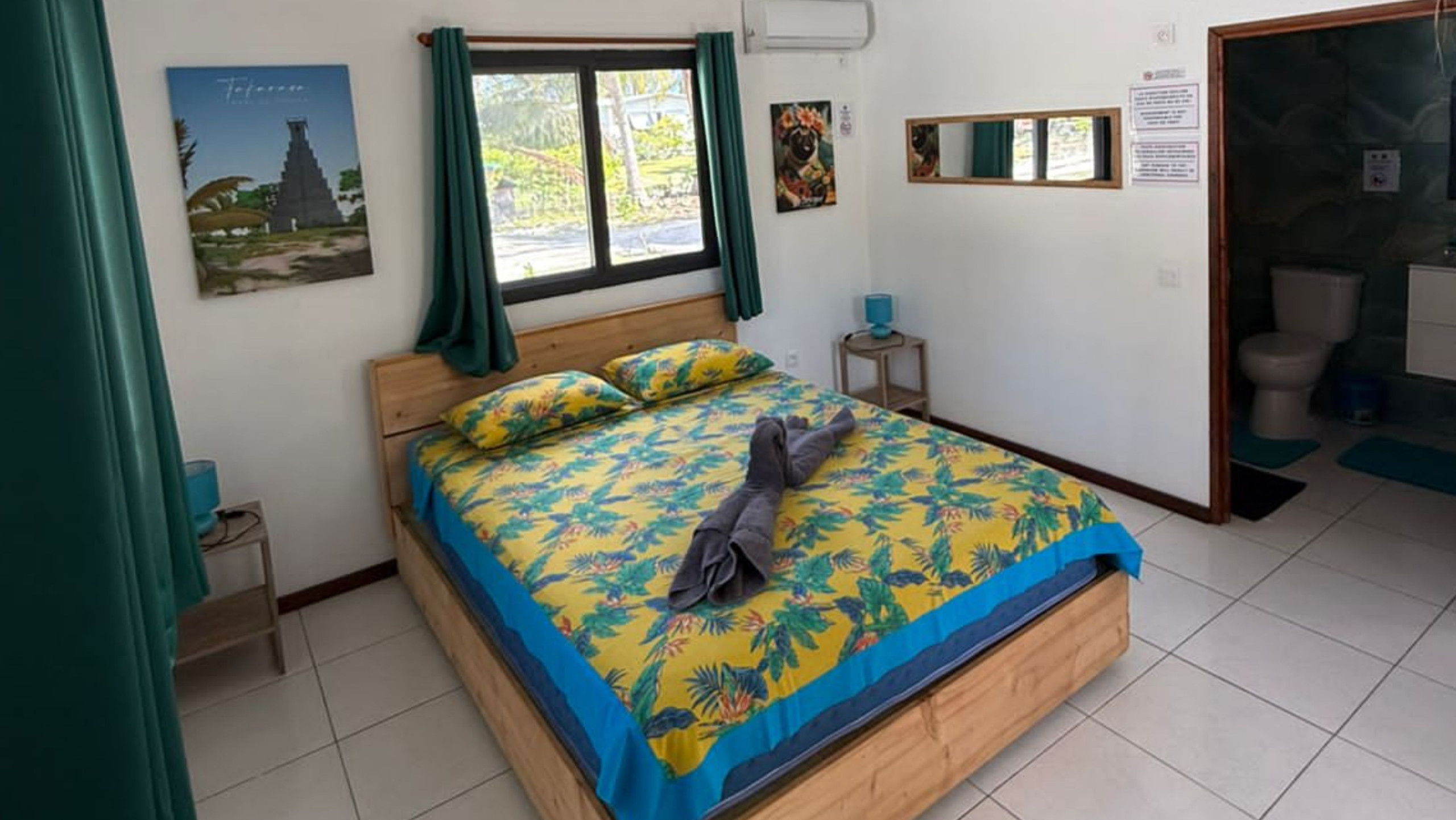 Le logement accueille jusqu’à 5 personnes et dispose d’un espace chambre avec deux lits queen-size et un lit simple. La grande terrasse couverte est parfaite pour partager un repas, se détendre après une journée au lagon ou simplement savourer la tranquillité de l’île. Vous trouverez une salle de bain intérieure avec eau chaude, complétée par une douche extérieure pratique au retour de la plage. La cuisine aménagée permet de préparer vos repas en toute autonomie, et le bungalow est équipé d’un wifi, d’une machine à laver et d’un coin étendoir pour plus de confort.