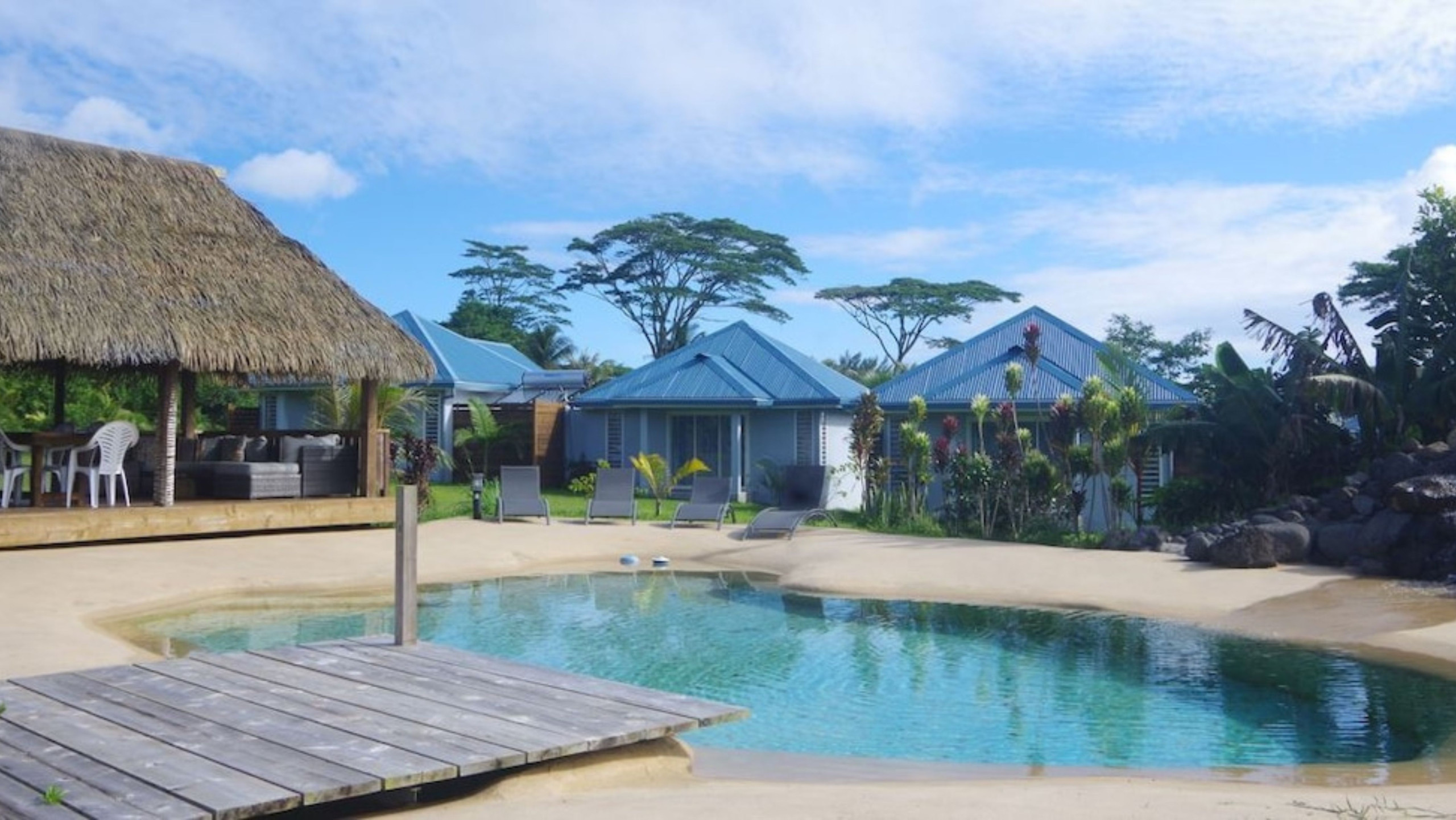 Vous accédez librement à la piscine paysagée avec cascade, ainsi qu’au fare poté’e, un espace convivial comprenant salon, grande table et cuisine d’été — idéal pour partager un moment en toute simplicité.
