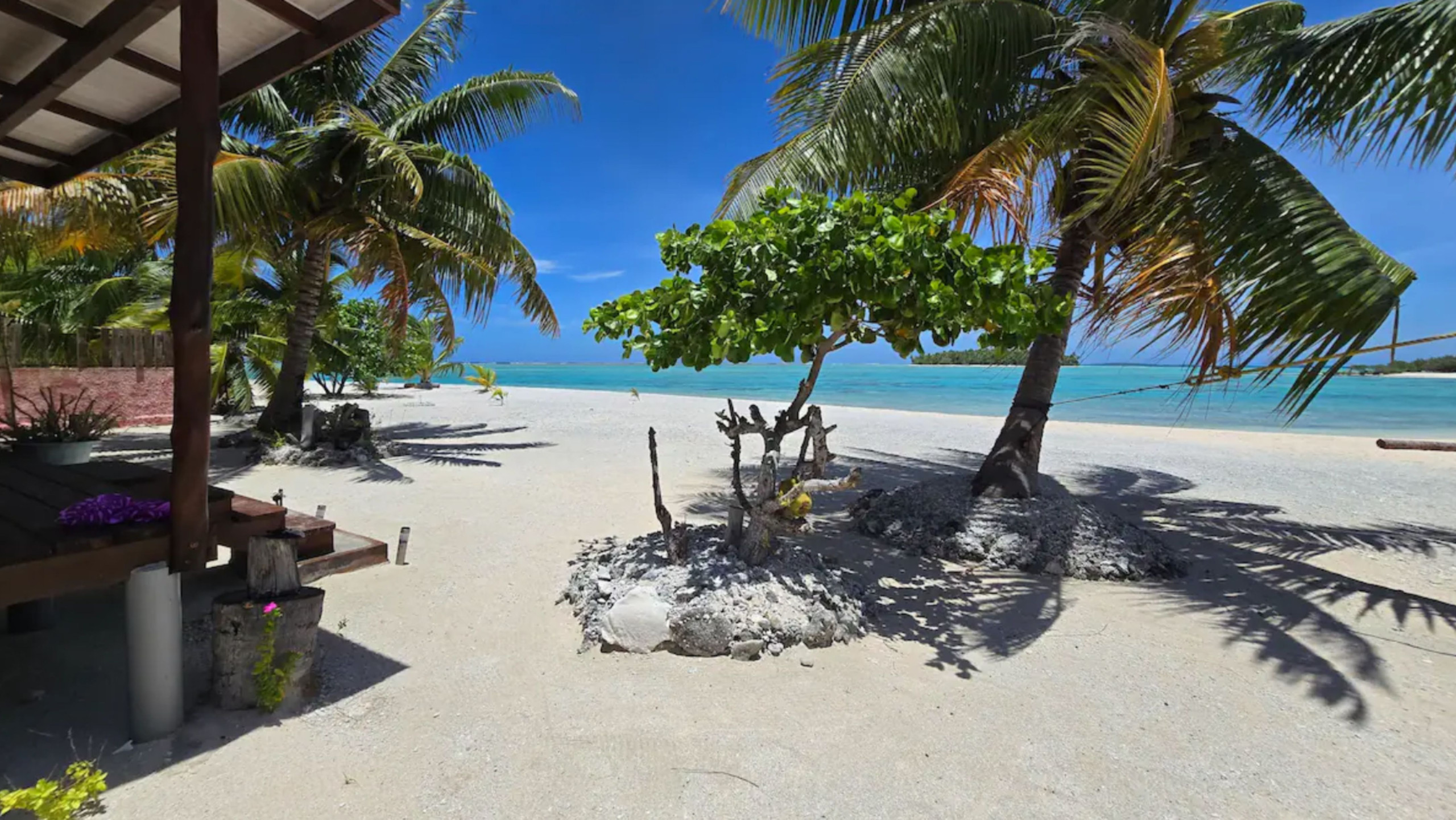 La salle de bain intérieure assure confort et intimité, tandis que la cuisine aménagée, située à l’extérieur, est partagée avec un second logement et vous permet de préparer facilement vos repas. Une petite terrasse privée, ainsi qu’un grand faré poté traditionnel, offrent des espaces où se détendre en profitant du cadre naturel. Ici, le jardin… c’est la plage : sable fin, brise du large et accès direct au lagon.