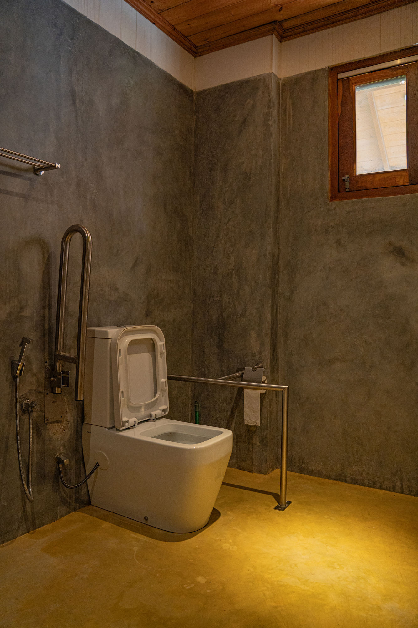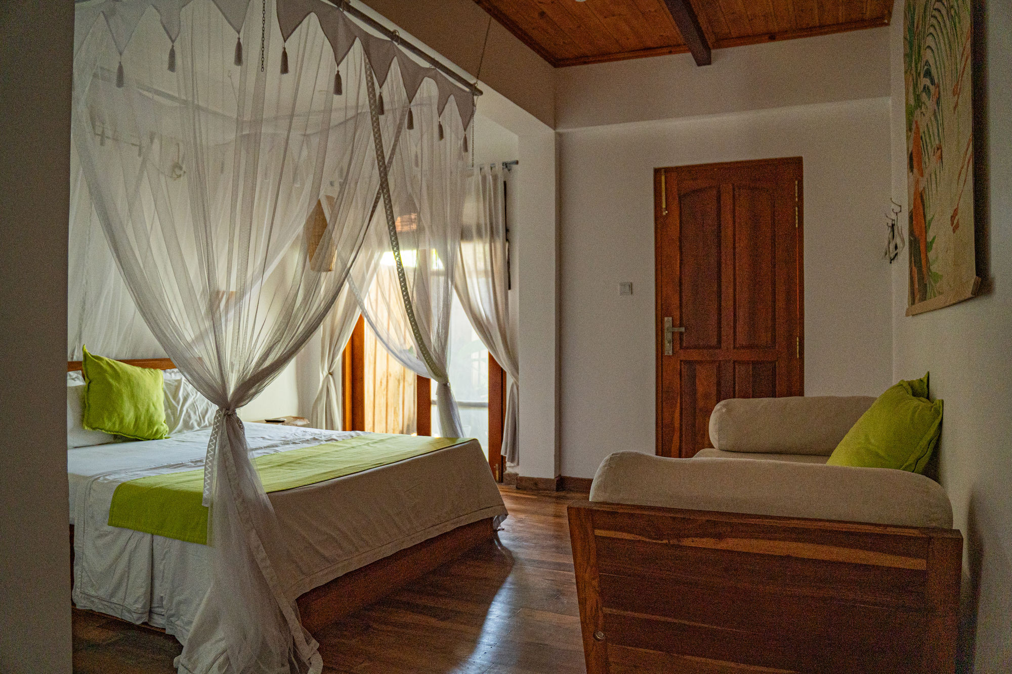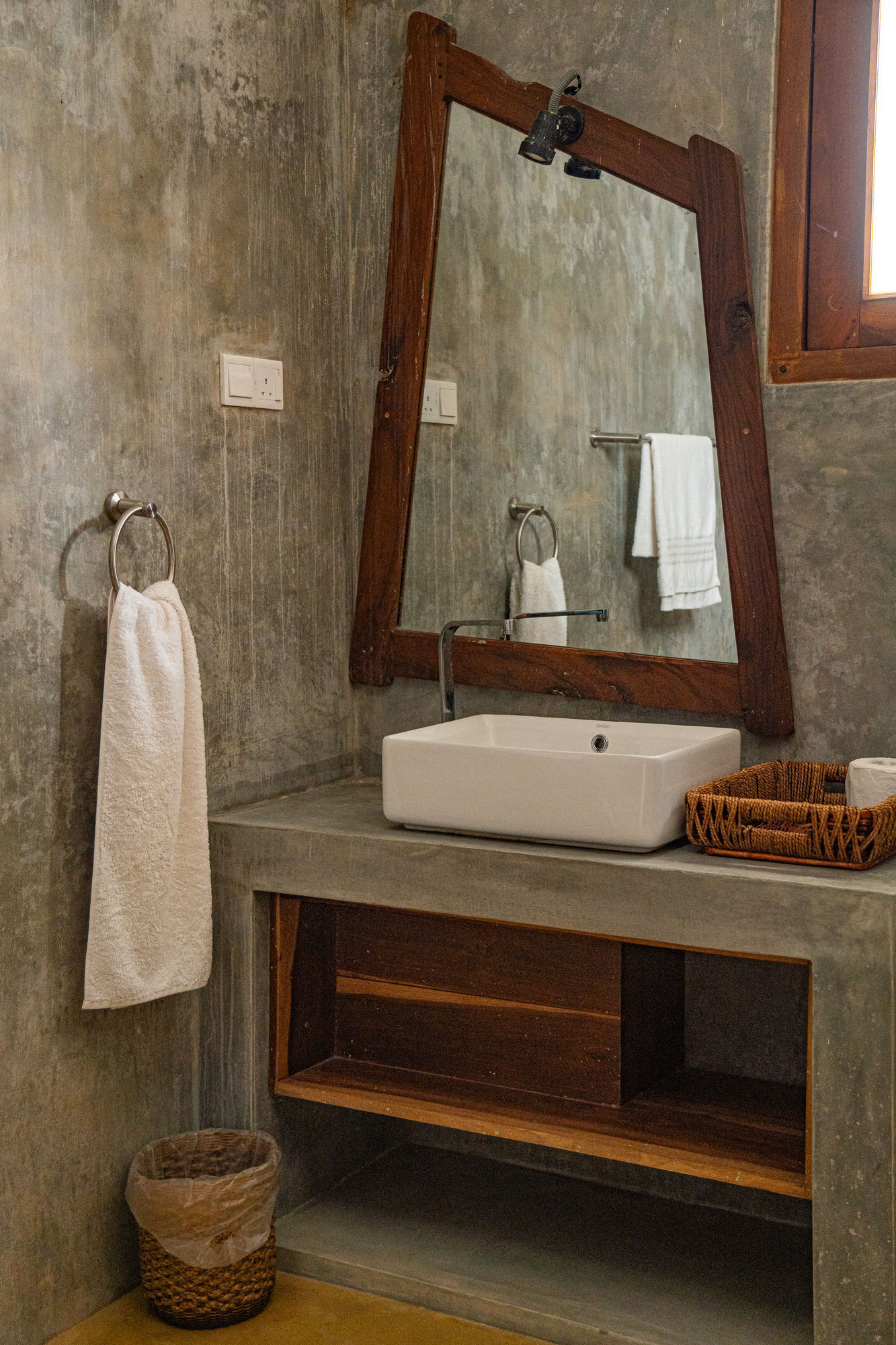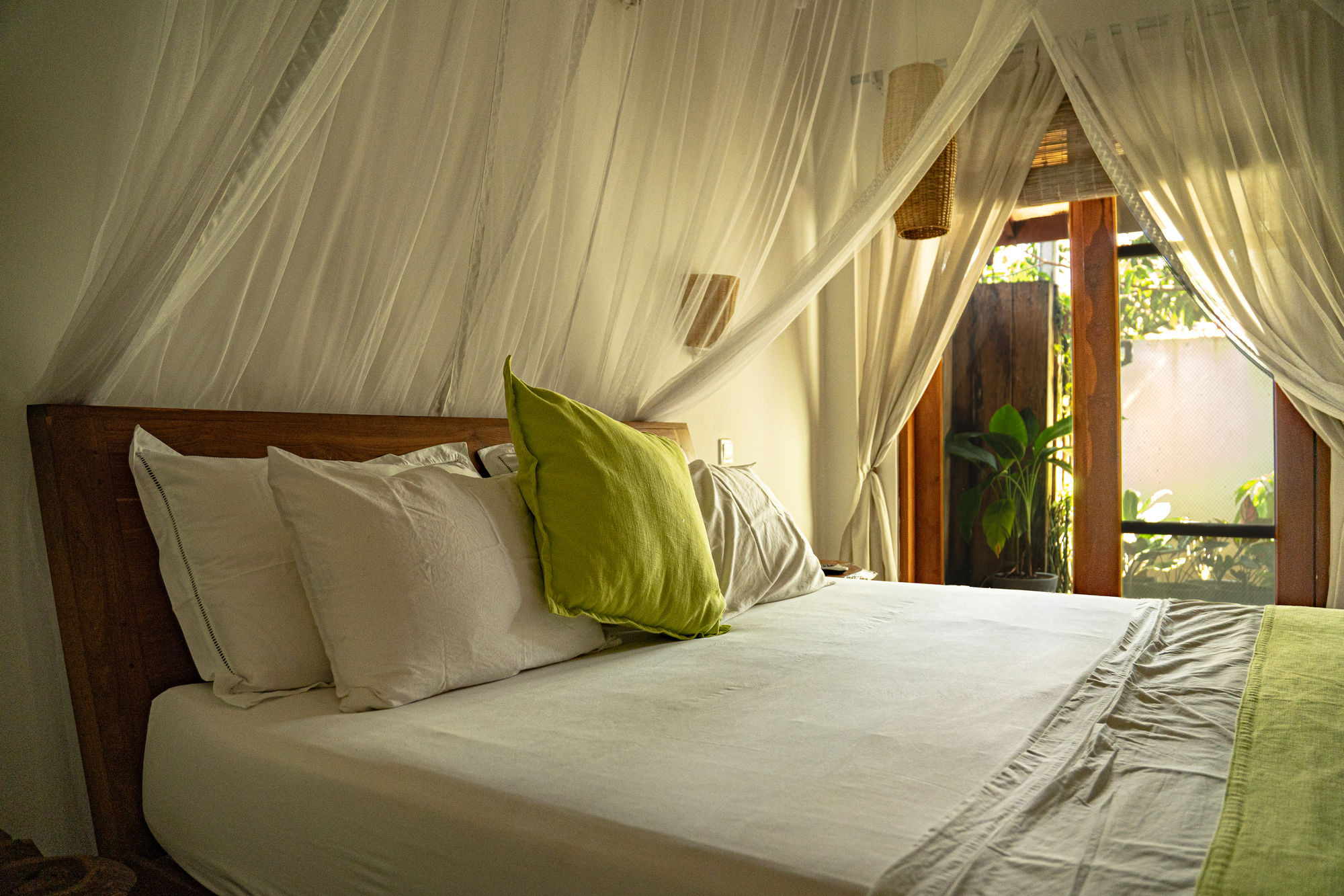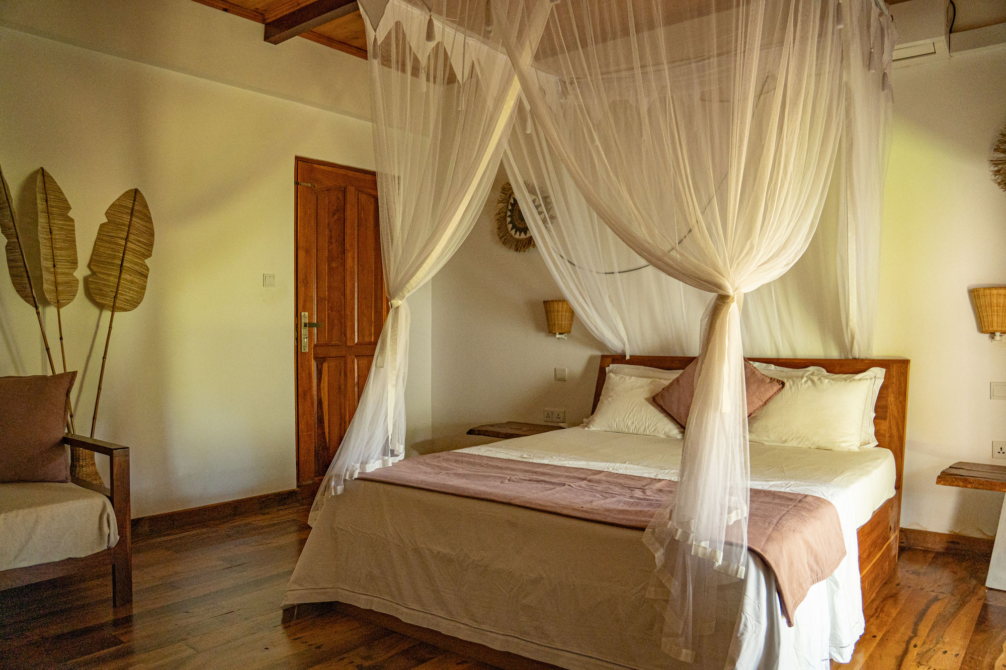 La villa s’organise autour de quatre suites spacieuses, toutes équipées de lits queen size et de litterie haut de gamme. Chaque chambre dispose de sa propre salle de bain privative, certaines avec douches extérieures en béton ciré qui invitent à des moments de détente en pleine nature, seul ou à deux. Les plafonds cathédrale accentuent la sensation d’espace et de liberté, tout en apportant fraîcheur et clarté.
