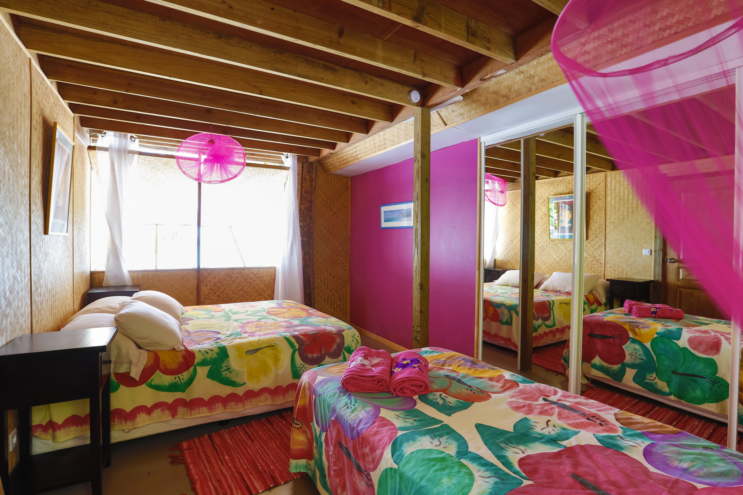 La maison est décorée dans un style polynésien simple et naturel, avec des matériaux locaux et une atmosphère conviviale.