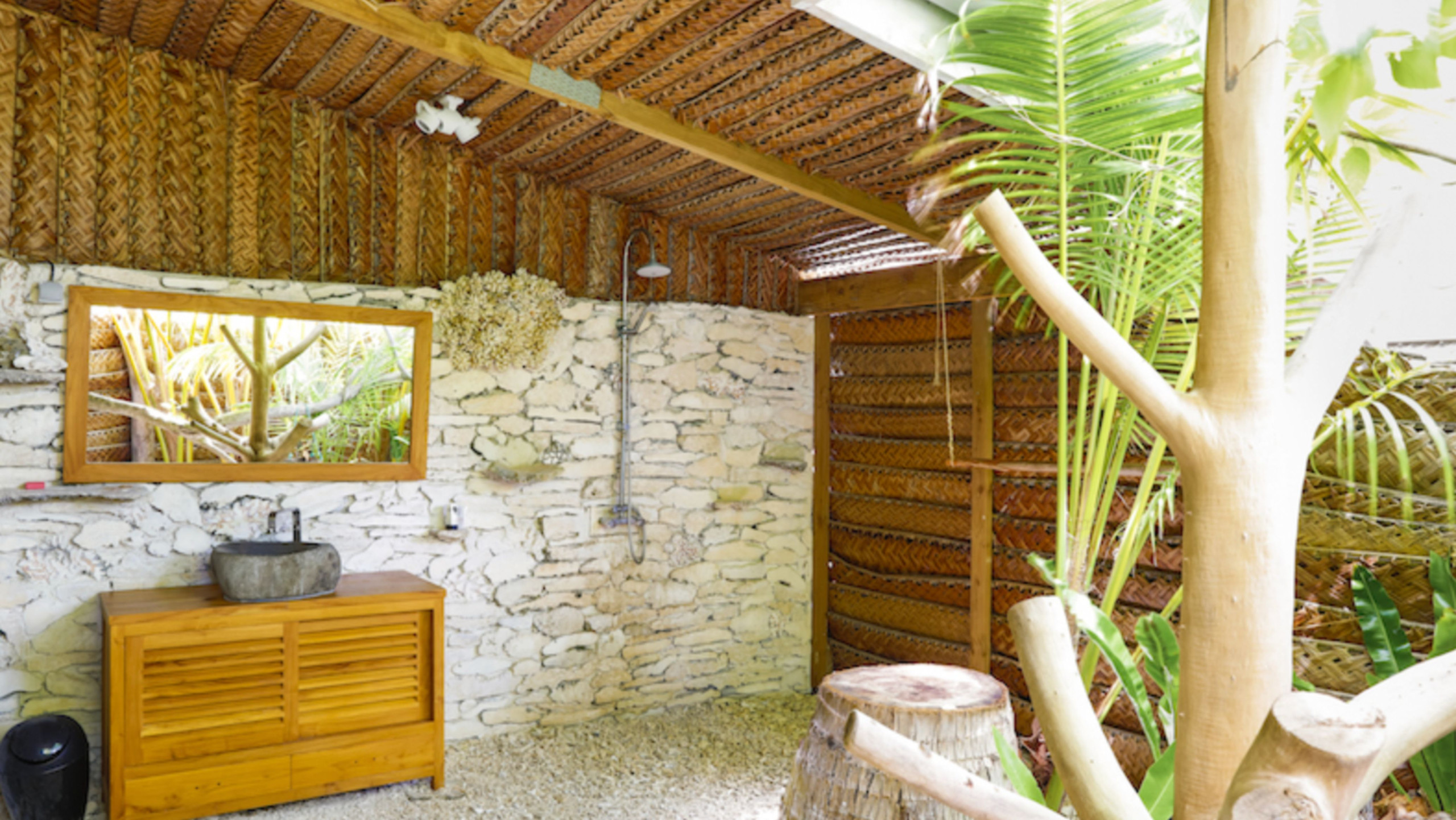 Une terrasse extérieure ombragée, parfaite pour admirer le lagon